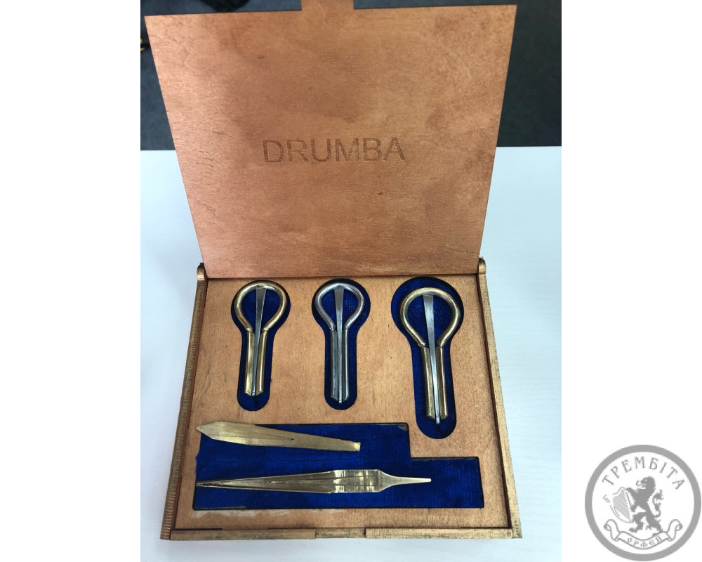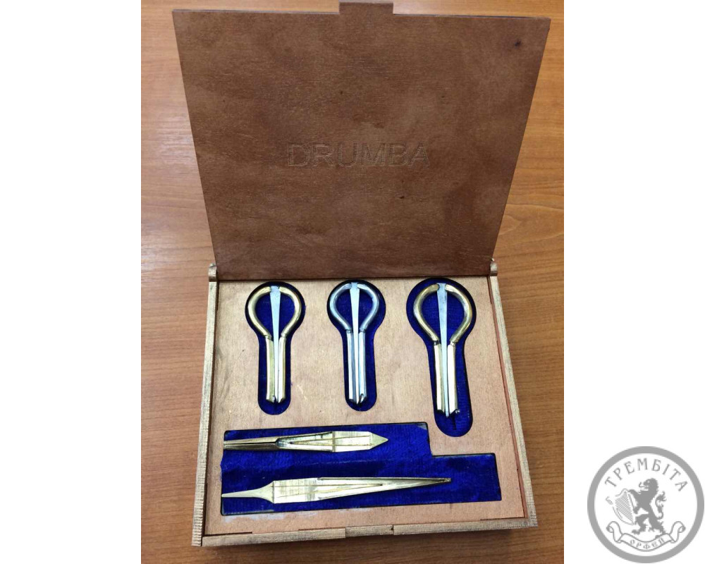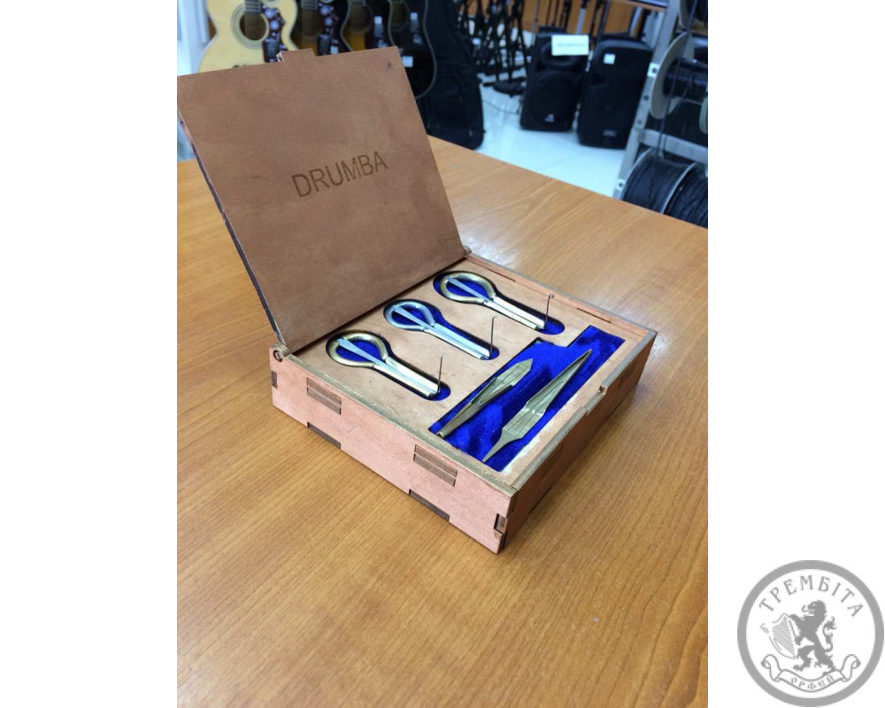 Подарунковий набір, до якого входять три дримб, розміщені в спеціальному футлярі. Вироблені вони майстром