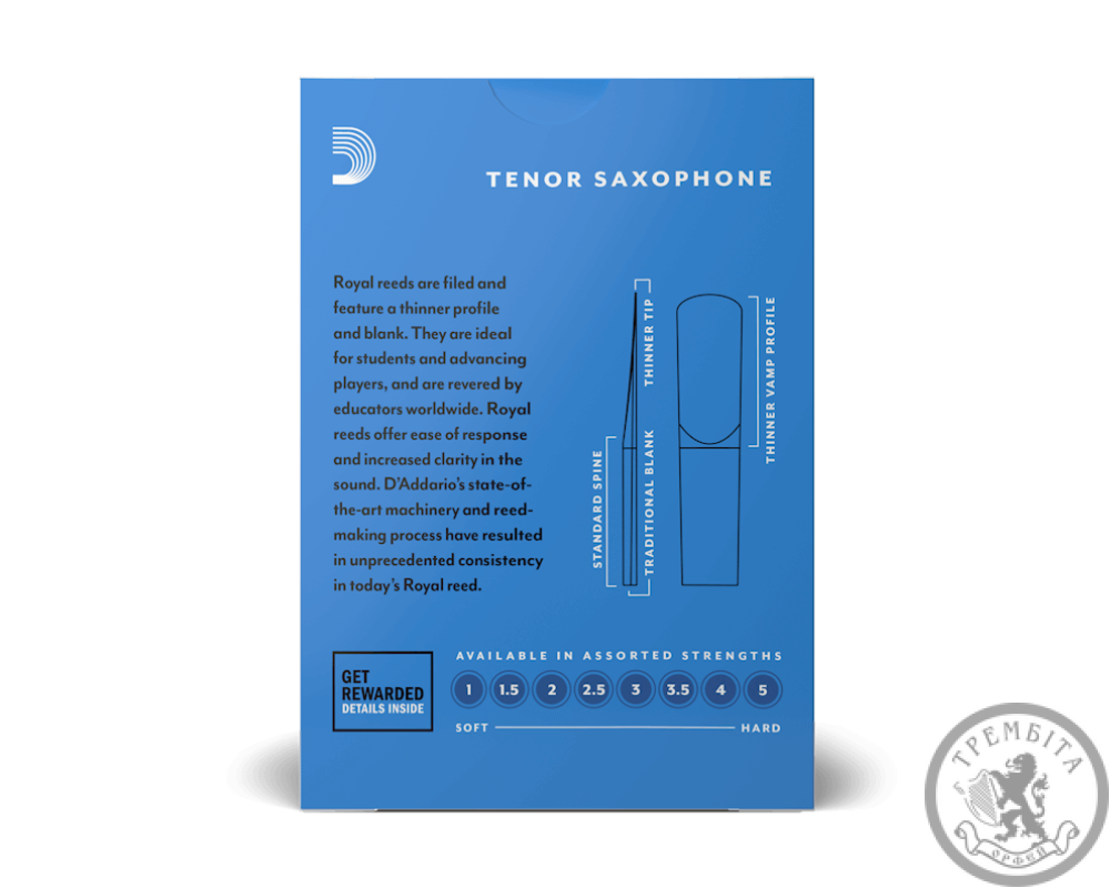 - Тростини серії Royal поєднують традиційний профіль і французький / подвійний зріз. Призначені для просунутих музикантів, ці тростини характеризуються рівномірним відгуком у всьому діапазоні і ясним прозорим звучанням.