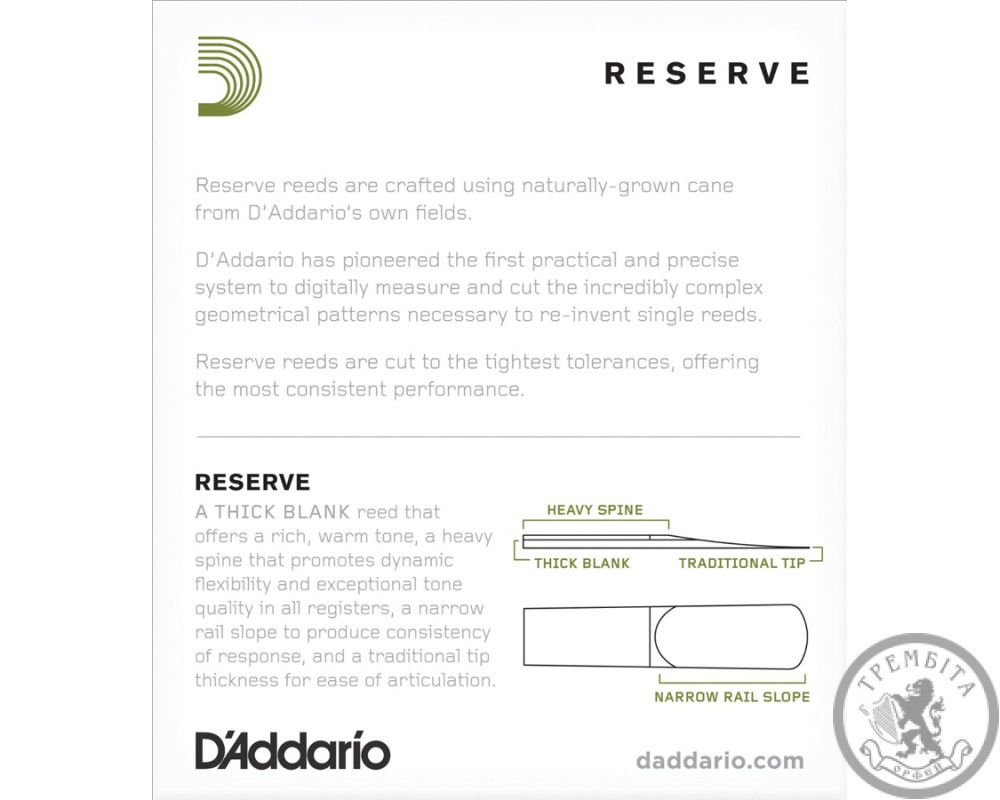 Тростини серії Reserve виготовлені з тростини, вирощеної в природних умовах на закордонних плантаціях, що належать компанії D’Addario. Саме фахівці D’Addario розробили першу високоточну систему, що дозволяє виробляти цифрові вимірювання і геометрично точне обрізання кожної тростини. Завдяки цьому тростини Reserve відрізняються чудовою надійністю і відмінним звучанням.