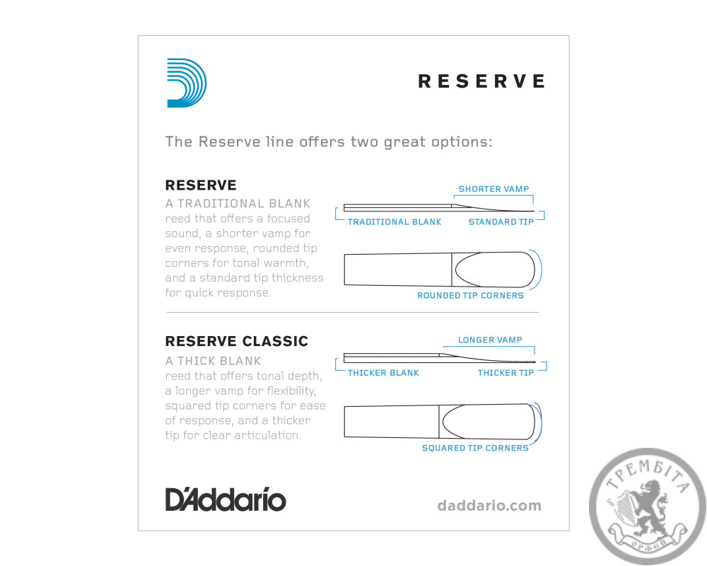 Тростина серії "Reserve" з традиційною спинкою для сфокусованого звучання, укороченим зрізом для рівномірного звучання, округленим профілем для тембральної глибини, і стандартним кінчиком для швидкого відгуку.