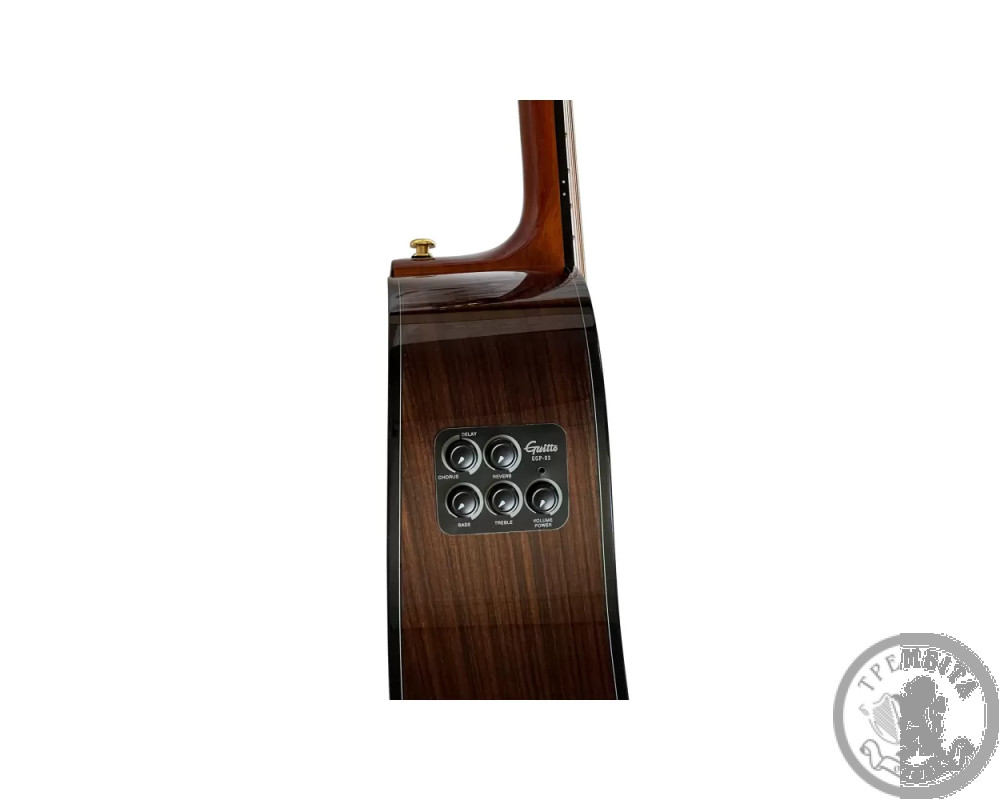 Трансакустична гітара Fiesta SPACE з цільною верхньою декою відрізняється не тільки своїм зовнішнім виглядом від інших гітар, але і має активний звукознімач TRANSACOUSTIC з ефектами CHORUS/DELAY/REVERB, еквалайзер BASS i TREBLE та ручку VOLUME POWER, яка не тільки включає/вимикає блок. Красива троянда на грифі, витончена перламутрова окантовка корпусу, якісна позолочена механіка, правильно оброблені поріжки на ладах, зручний радіус та ширина грифу, глибоке та багате звучання. У комплекті йде фірмовий чохол, акумулятор і зарядний пристрій до нього, пікгард з написом TRANSACOSTIC і анкерний ключ. /REVERB, еквалайзер BASS i TREBLE та ручку VOLUME POWER, яка не тільки регулює рівень звуку, а й включає/вимикає блок. Красива троянда на грифі, витончена перламутрова окантовка корпусу, якісна позолочена механіка, правильно оброблені поріжки на ладах, зручний радіус та ширина грифу, глибоке та багате звучання. У комплекті йде фірмовий чохол, акумулятор та зарядний пристрій до нього, пікгард із написом TRANSACOSTIC та анкерний ключ.