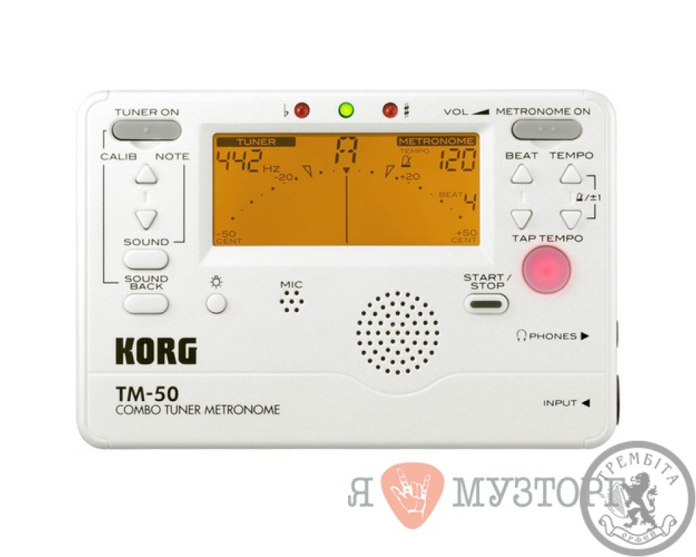 Цифровий тюнер-метроном Korg TM50-PW може похвалитися значною начинкою, вміщеною в невеликий, стильний і ергономічний корпус перламутрово-білого кольору. Модель оснащена режимами Sound Back і Sound Out, великим псевдо-стрілочним LCD-дисплеєм і чутливим мікрофоном, завдяки яким ви зможете здійснювати настройку практично будь-якого музичного інструменту.