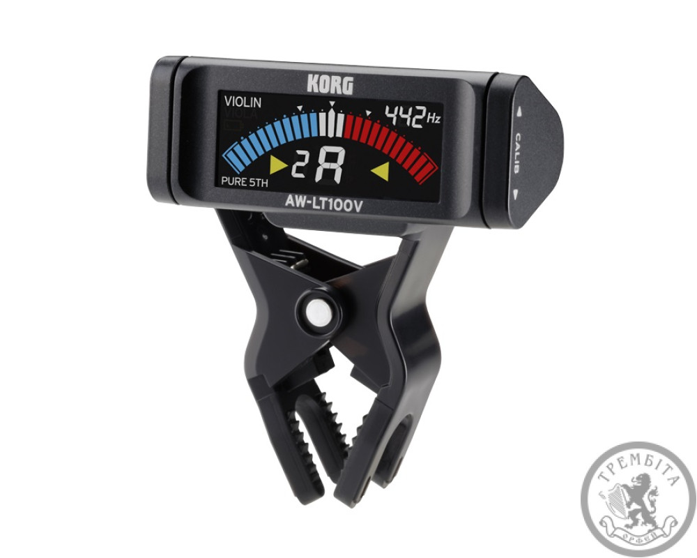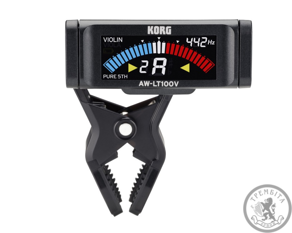 KORG AW-LT100V - Тюнер типу кліпса для оркестрових інструментів, діапазон A0 (27.50 Гц) - C8 (4186 Гц), живлення від 1 батарейки ААА, робота від батарейки близько 100 годин, колір чорний.