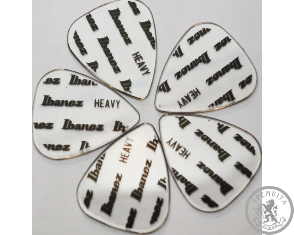 ПОВНИЙ ОПИС - Упаковка медіаторів (50 шт), товщина H (1мм), колір - білий, з написами Ibanez