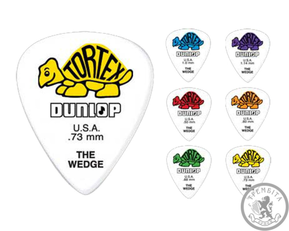 Медіатори Tortex Wedge крім білого кольору характеризуються більшою площею захвата і загостреним наконечником.