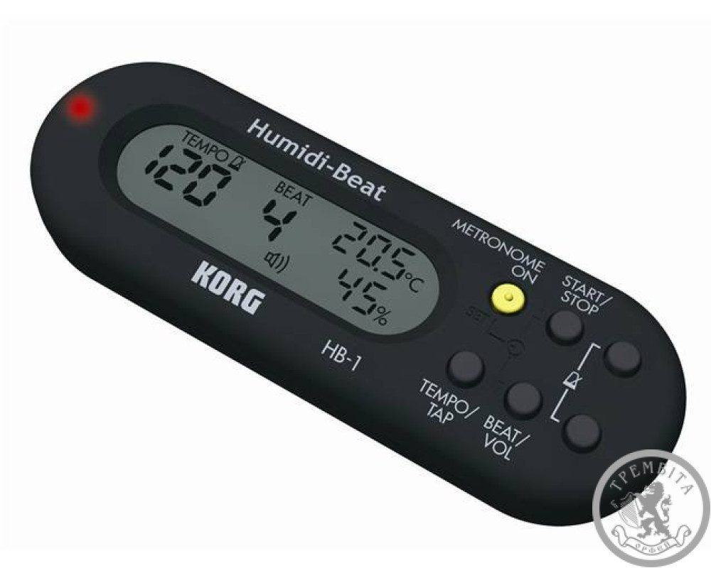 У метроном чорного кольору KORG HUMIDI-BEAT HB-1-BK вбудований вимірювач вологості і температури, який допомагає стежити за навколишнім середовищем, адже екстремальні коливання температури, надмірна сухість або вологість можуть зіпсувати інструмент. Представлений пристрій вимірює ці дані з інтервалом в 10 секунд, а потім на дисплеї з'являється індикація Lo / Hi (якщо вологість підвищена).