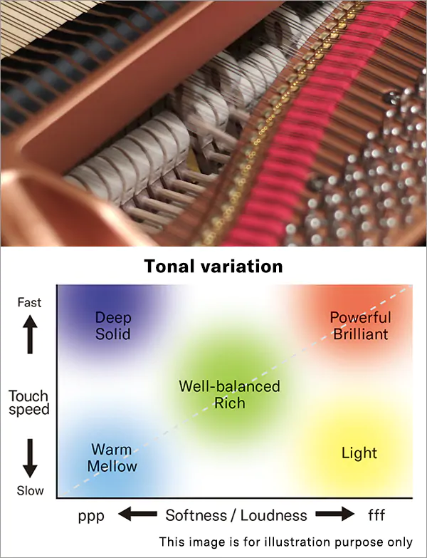 Звуки рояля Clavinova записані з декількох всесвітньо відомих концертних роялів. Один з них - CFX, найкращий концертний рояль Yamaha. Піаністи усього світу зачаровані вражаючим, співочим, багато виразним звуком CFX в концертних залах. Ще один концертний рояль - Imperial, флагманська модель Bösendorfer, освяченого століттями віденського фортепіанного бренду. Imperial відомий своїм достатком фарб і природною теплотою. Компанія Yamaha точно відтворює особливості цих концертних роялів, ретельно записуючи весь тональний діапазон кожної з 88 клавіш, вловлюючи найбільш гармонійні тембри, які може запропонувати кожна модель.