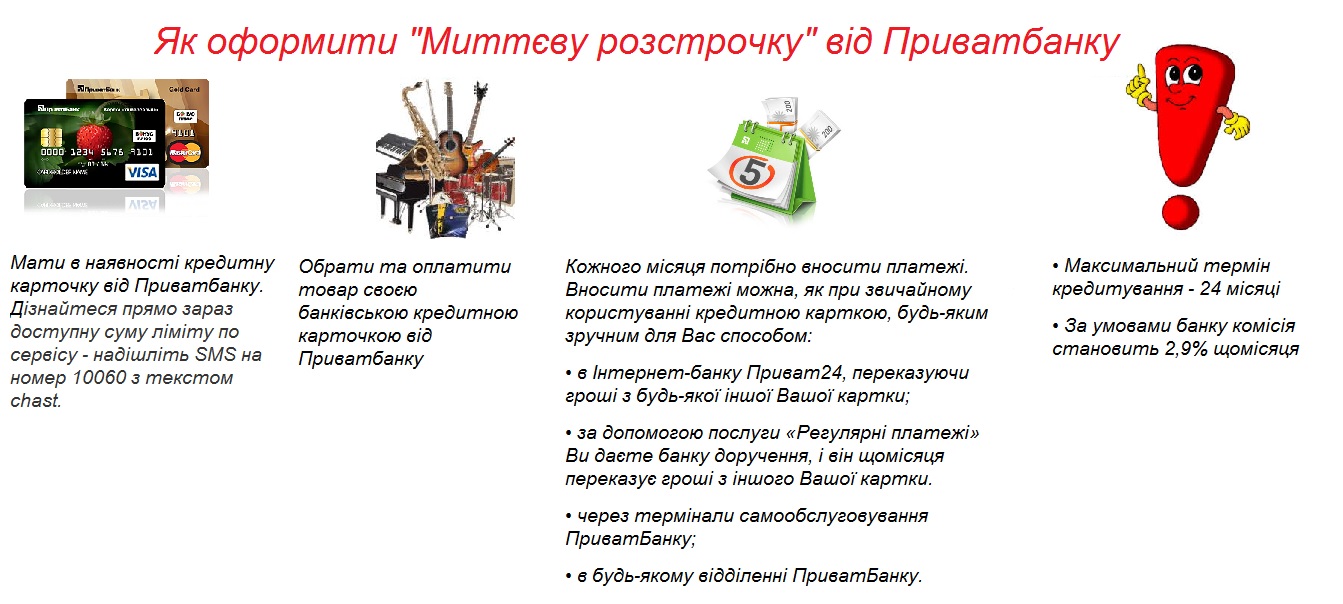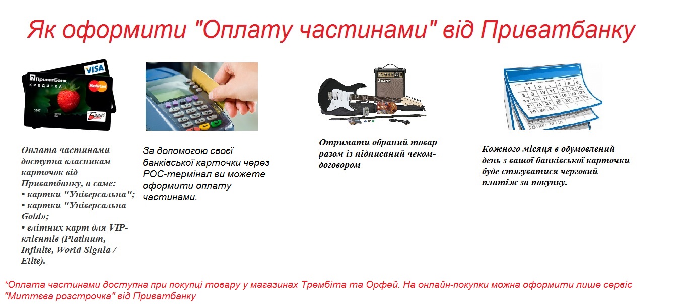 У нашому магазині діє сервіс "Оплата частинами" та "Миттєва розстрочка". Що це за послуга? Це сервіси, за допомогою яких Ви можете здійснювати покупки в усіх магазинах мережі Трембіта, а також онлайн, розбиваючи суму покупки на кілька платежів.