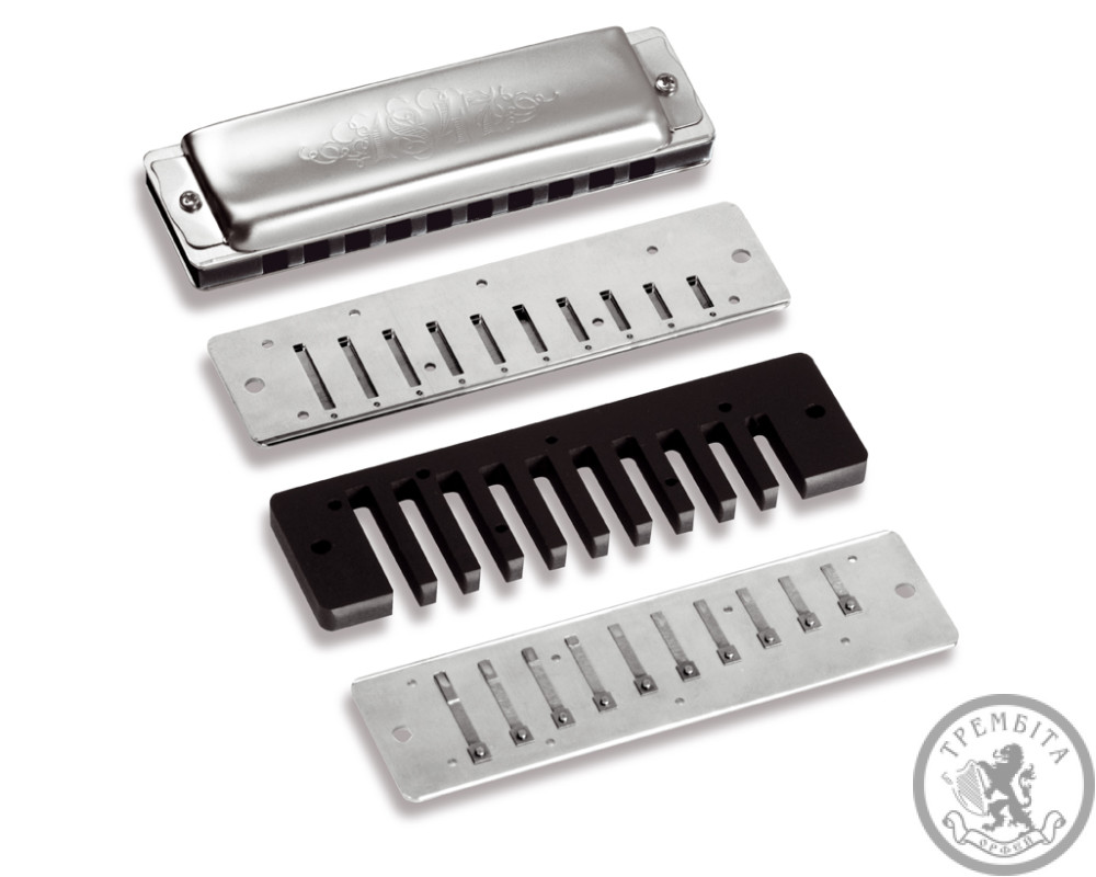- Конусная форма язычковых пластин в районе низких нот, предотвращает хрипы и искажения при игре на 1 и 2 отверстиях
