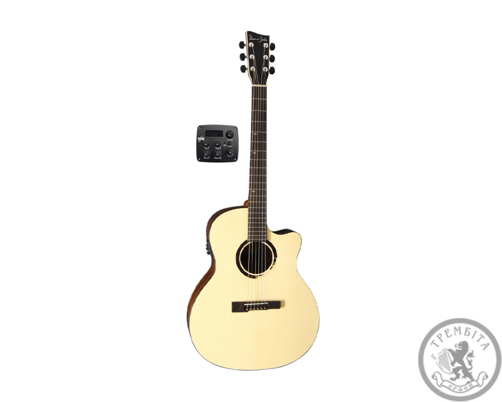 Технічні характеристики VGS R-10 CE Rose: Електроакустичний дредноут з вирізом Топ з цілісної ялини Задня дека і обичайка з палісандра Гриф з махагони , накладка і струнотримач з палісандра Мензура 648мм . Ширина грифа в області верхнього порожка 43 мм. двосторонній анкер Акустичне отвір Katayama Поріжок і струнотримач з інкрустацією з кістки Дерев’яна розетка Хромована кілкова механіка з чорними ручками з ебоніту Чорна окантовка корпусу , голова грифа з окантовкою з клена Поставляється з прозорим пікгард Fishman Presys + з інтегрованим тюнером Колір: Natural Stain