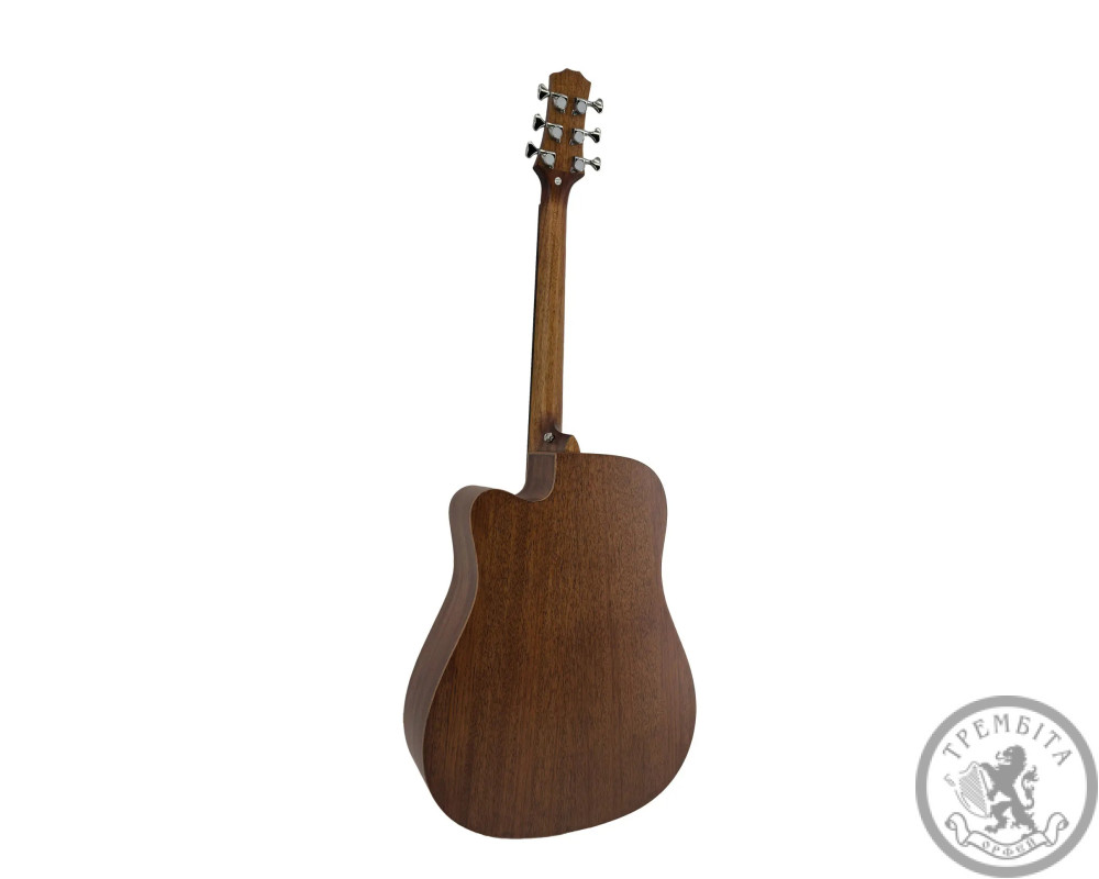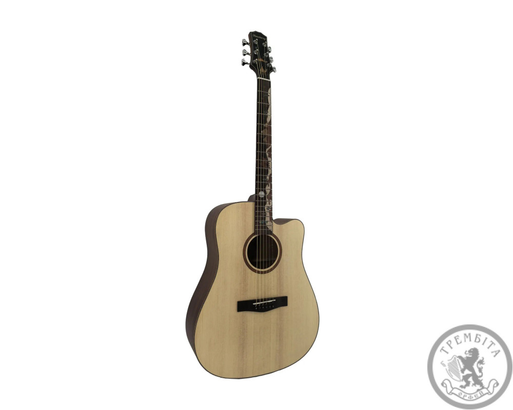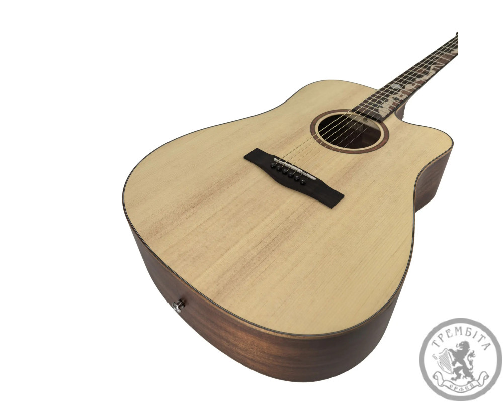 Корпус розміром 41 дюйм призначений для повного, потужного звучання з хорошим резонансом. Верхня дека поєднує масив ялини та махаґоні, даруючи баланс між дзвінкою чіткістю та глибоким теплим тоном. Задня частина та боковини з ламінованого махаґоні підсилюють цей ефект, роблячи звук виразним, але не агресивним. Глянцева поверхня надає інструменту яскравості, а палісандрова накладка на гриф забезпечує комфорт і точність у грі.