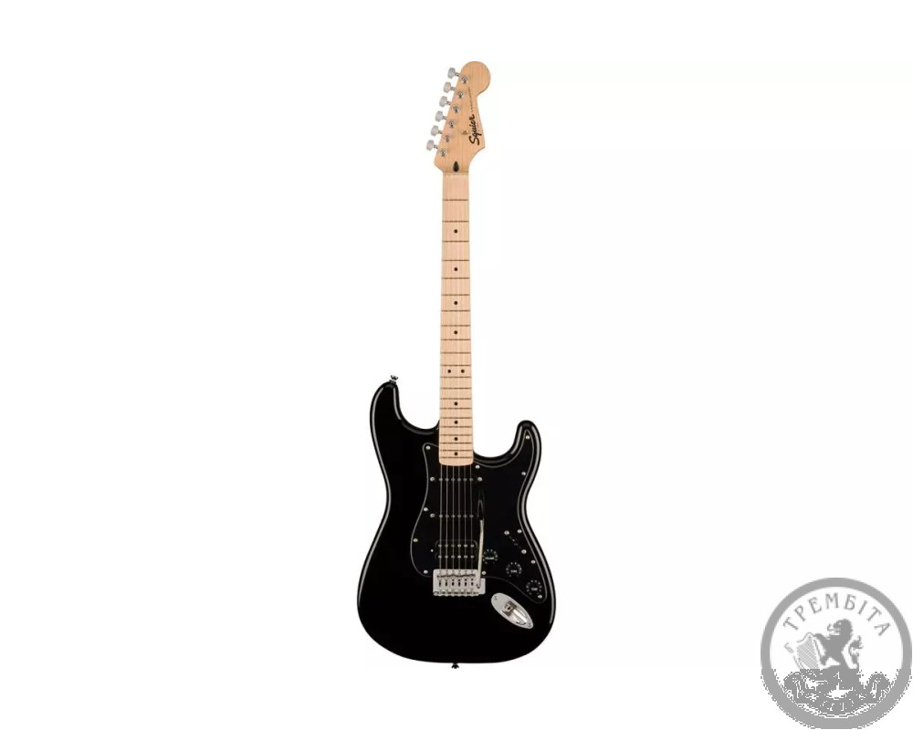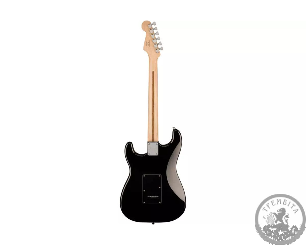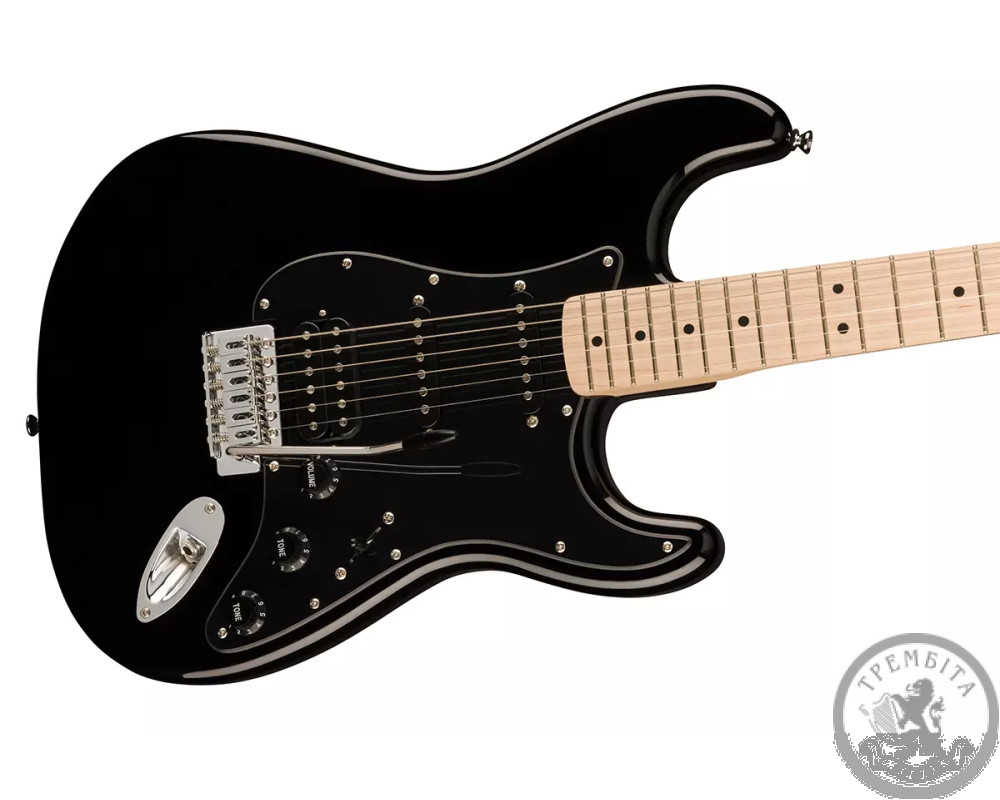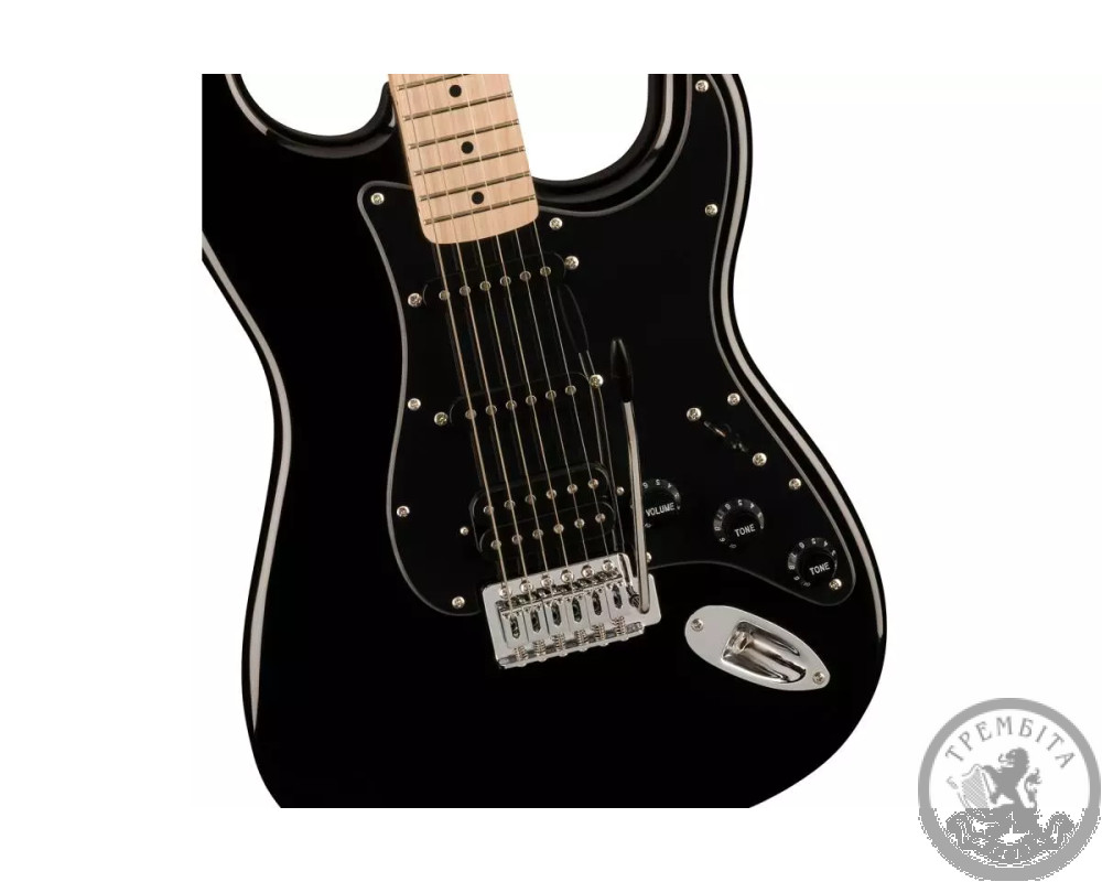 Основні особливості електрогітари Squier by Fender Sonic Stratocaster HSS MN Black: Тонкий і легкий корпус з тополі; "С"-подібний гриф з клену; Звукознімачі: Ceramic Humbucker бридж, Ceramic Single-Coil нек і мідл; 6-сідловий Vintage-Style Synchronized Tremolo бридж; Хромована фурнітура; Колір – чорний.