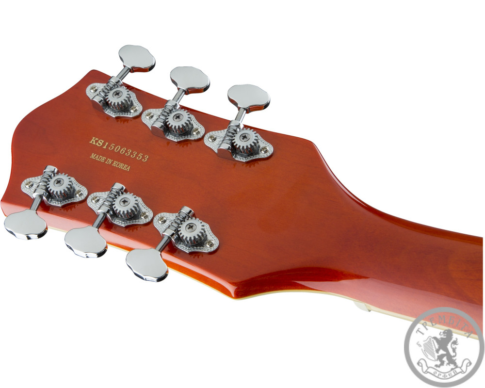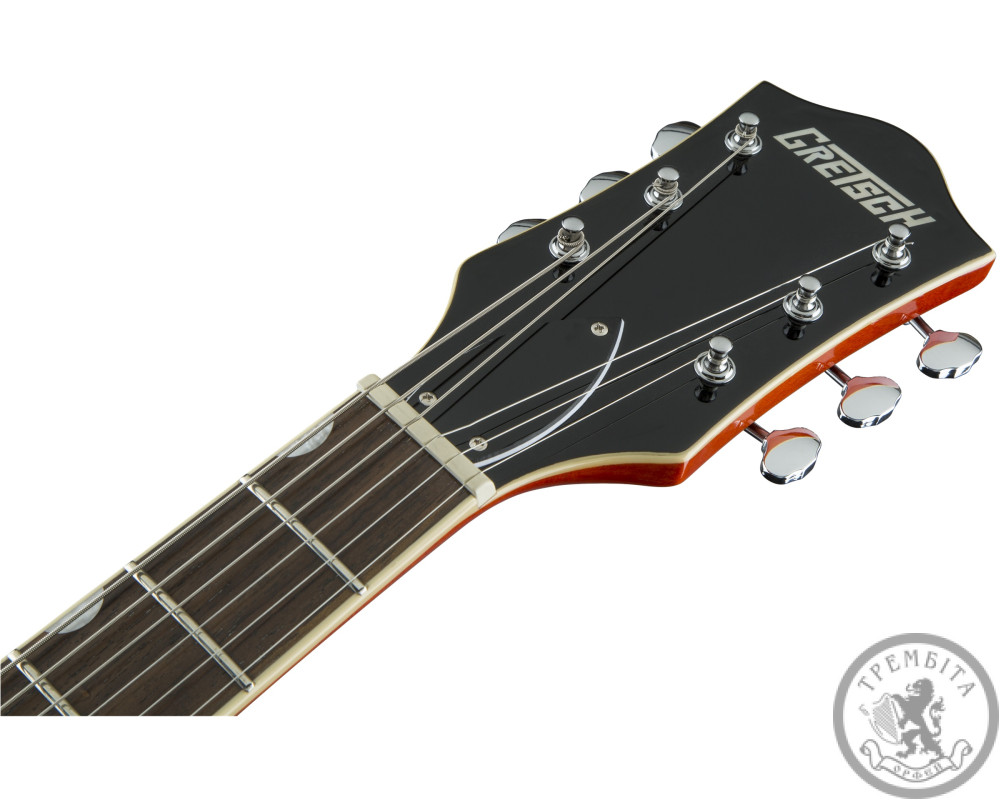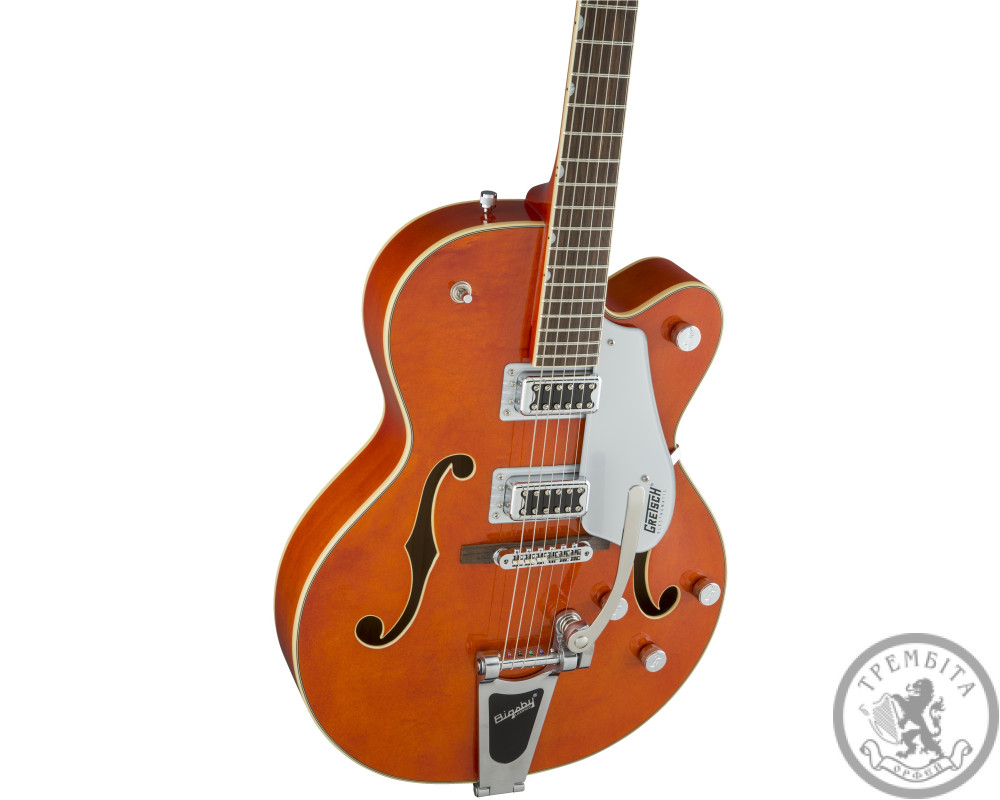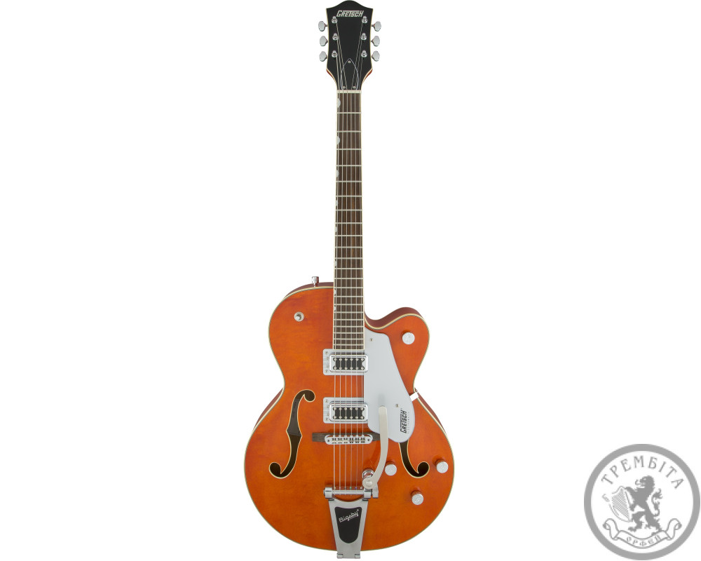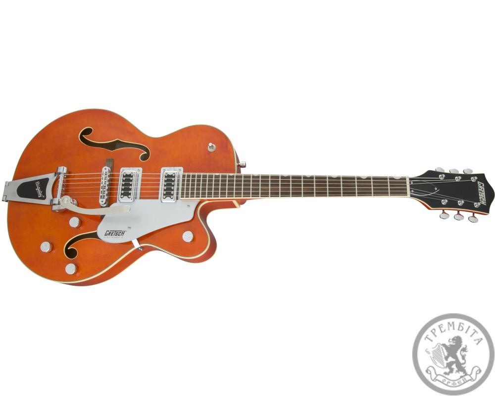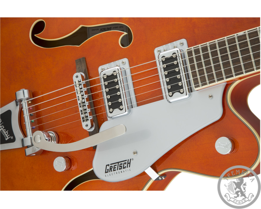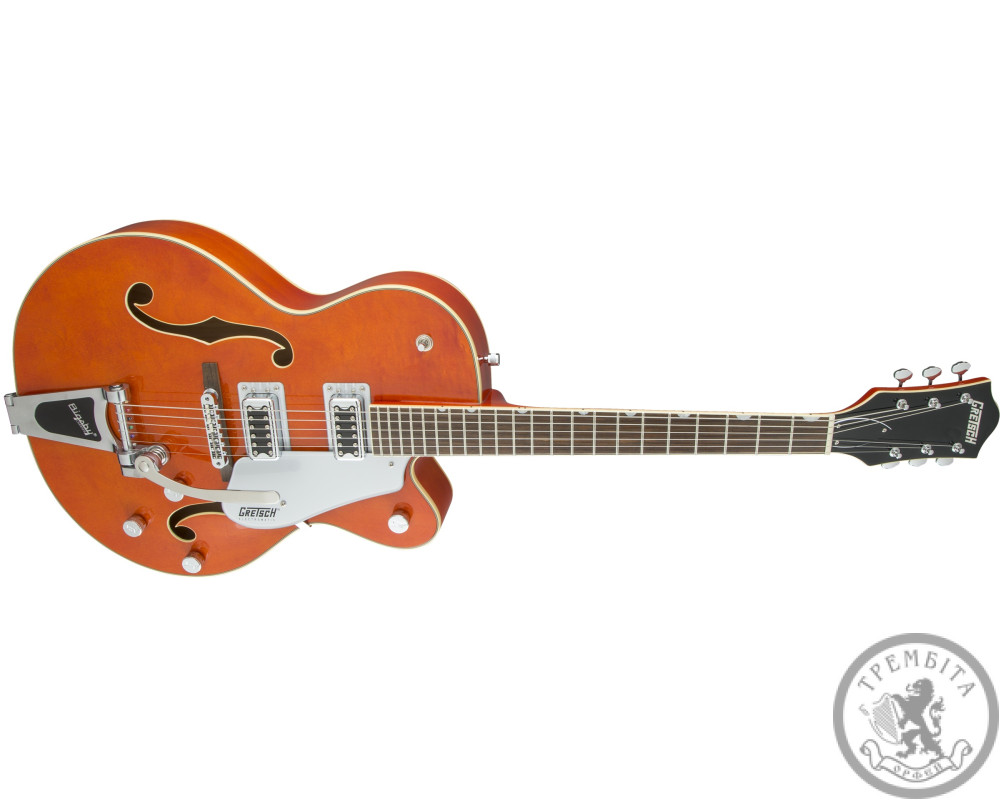 GRETSCH G5420T ELECTROMATIC HOLLOW BODY SINLE CUT- полуакустическая электрогитара с полым корпусом из линейки Electromatic®. Классическая модель GRETSCH с узнаваемым звуком и традиционным дизайном. Звучание инструмента - мощное, динамичное, очень четкое, с прекрасной артикуляцией. Гитара заключена в корпус формы Electromatic® с одним вырезом, выполненный из пяти слоев кленовой древесины. Конструкция корпуса и отверстия формы «f» в верхней деке обеспечивают прекрасный резонанс. Гриф - кленовый, с глянцевой отделкой. Мензура - 648 мм (25.5 дюйма). Накладка - палисандровая, радиус - 12 дюймов (305 мм). На грифе 22 лада Medium Jumbo с оригинальной перламутровой инкрустацией Neo-Classic ™ Thumbnail по краю. Порожек - Graph Tech® TUSQ XL. Звукосниматели - два хамбакера собственной разработки Blacktop ™ Filter'Tron ™. Переключатель - 3-позиционный. В дополнение к регуляторов тембра и общего уровня громкости предусмотрены отдельные регуляторы громкости для каждого из звукоснимателей. Палисандровое бридж Adjusto-matic ™ обеспечивает надежность строя, а тремоло Bigsby® B60 дает широкие возможности для экспрессивной игры. Модель представлена в ярком оранжевом цвете с регуляторами формы G-Arrow и контрастным серебристым пикгард с черным логотипом Gretch.