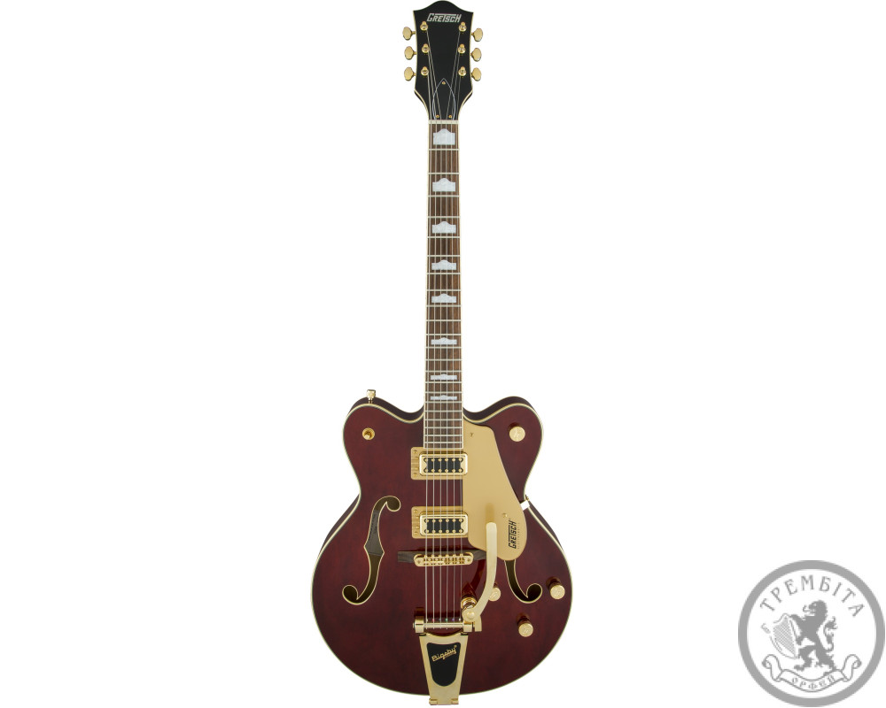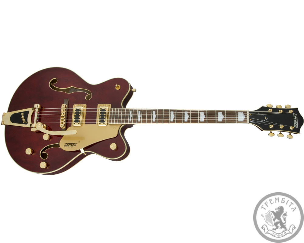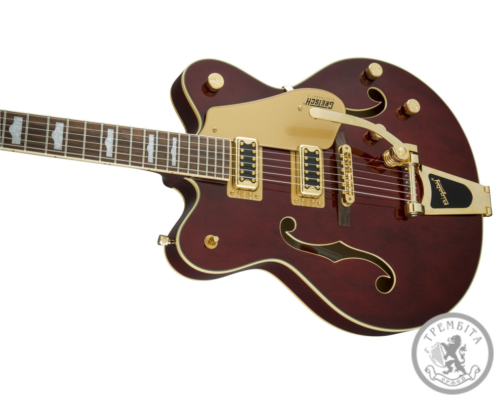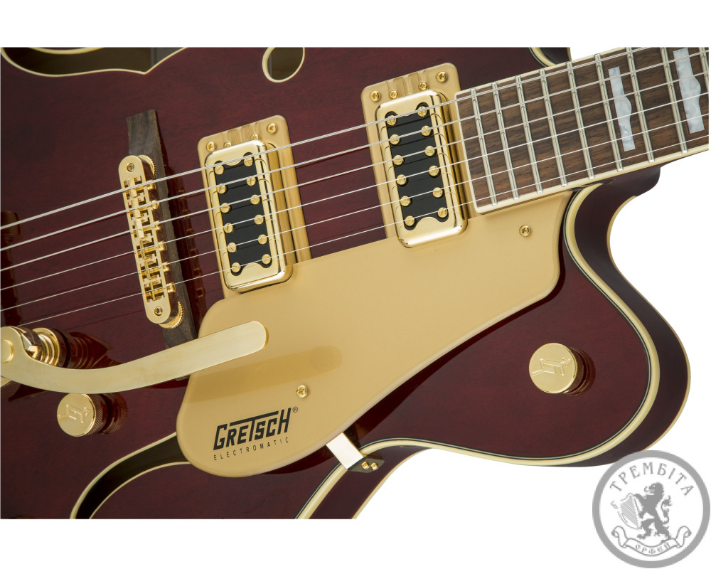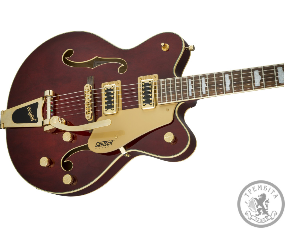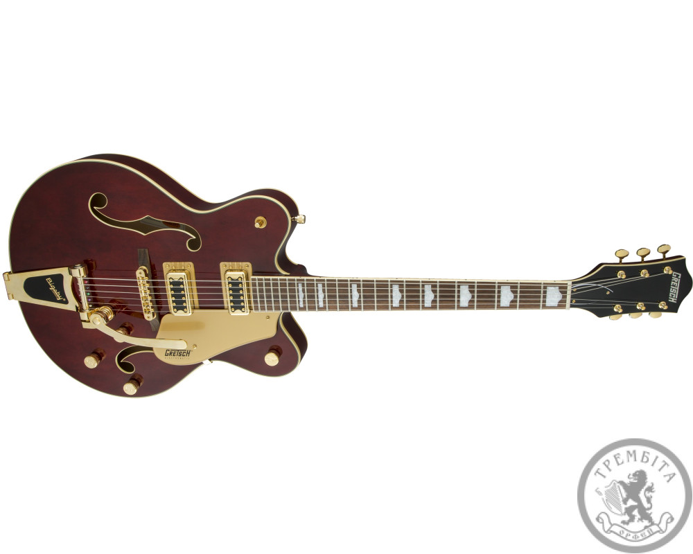 GRETSCH G5422TG ELECTROMATIC HOLLOW BODY DOUBLE CUT WALNUT STAIN GOLD HARDWARE - электрогитара с полым корпусом из линейки Electromatic. Классическая модель с узнаваемым звуком и традиционным дизайном. Звучание инструмента - мощное, динамичное, очень четкое, с прекрасной артикуляцией. Гитара заключена в корпус формы Electromatic® с двумя вырезами, выполненный из пяти слоев кленовой древесины. Конструкция корпуса и отверстия формы «f» в верхней деке обеспечивают прекрасный резонанс. Гриф - кленовый, с глянцевой отделкой. Мензура - 625 мм (24.6 дюйма). Накладка - палисандровая, радиус - 12 дюймов (305 мм). На грифе 22 лада Medium Jumbo с оригинальной инкрустацией перламутровыми прямоугольниками с выступлением. Порожек - Graph Tech® TUSQ XL. Председатель грифа выполнена в стиле гитар конца 50-х годов. Звукосниматели - два хамбакера собственной разработки Blacktop ™ Filter'Tron ™. Переключатель - 3-позиционный. В дополнение к регуляторов тембра и общего уровня громкости предусмотрены отдельные регуляторы громкости для каждого из звукоснимателей. Палисандровое бридж Adjusto-matic ™ обеспечивает надежность строя, а тремоло Bigsby® B60 дает широкие возможности для экспрессивной игры. Модель представлена в красивом ореховом цвете с регуляторами формы G-Arrow, золотой фурнитурой и золотистым пикгард с контрастным черным логотипом Gretch.