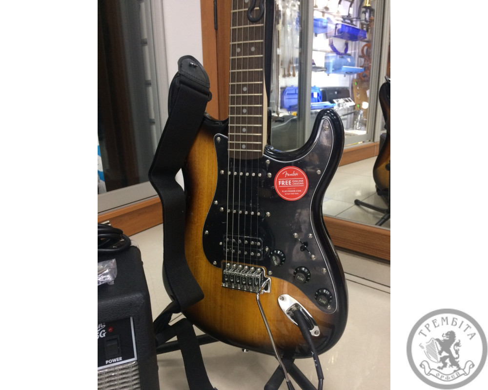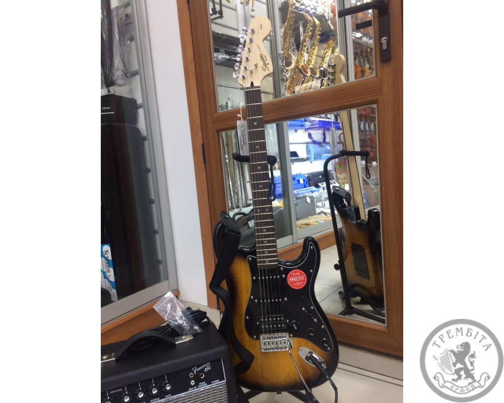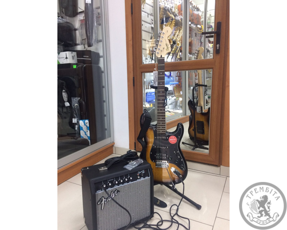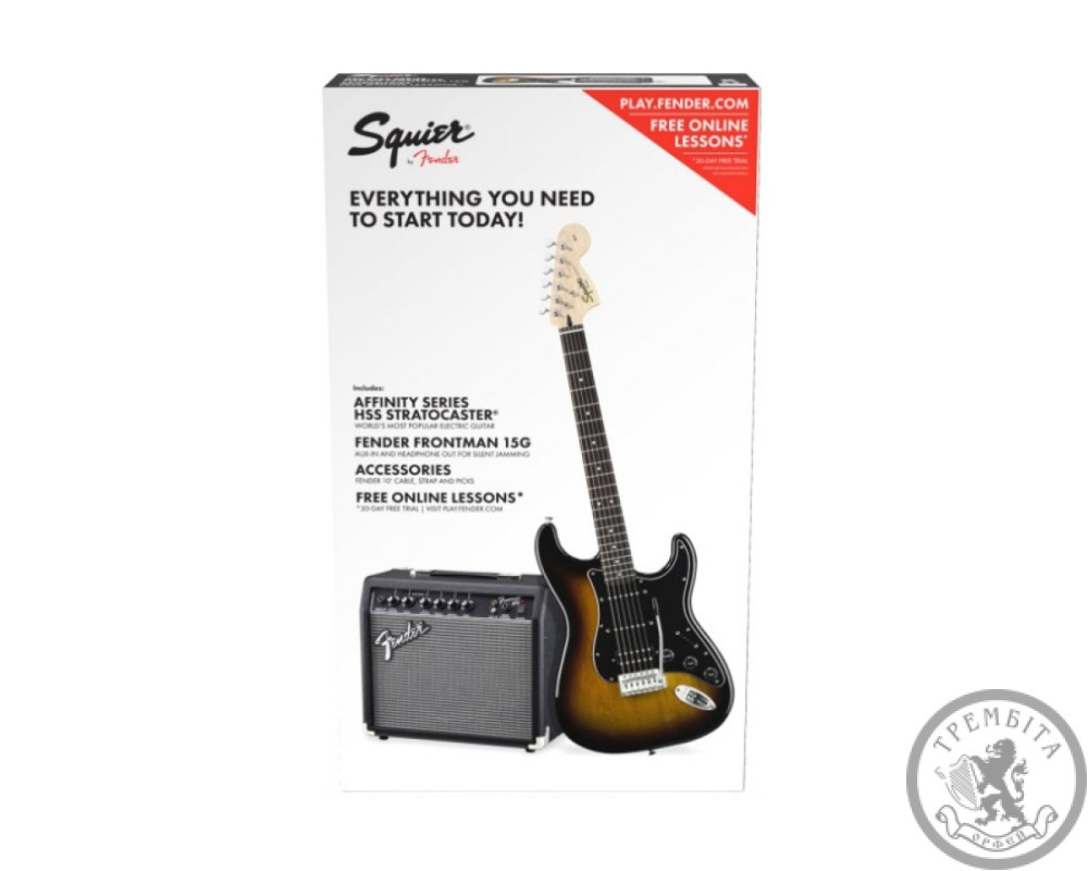 SQUIER by FENDER STRAT PACK BROWN SUNBURST – комплект для начинающих гитаристов, включающий в себя электрогитару Squier Affinity Series Stratocaster HSS, комбоусилитель Frontman 15G и все необходимые аксессуары для того, чтобы можно было сразу начинать играть: инструментальный кабель для подключения, ремень для гитары и медиаторы.