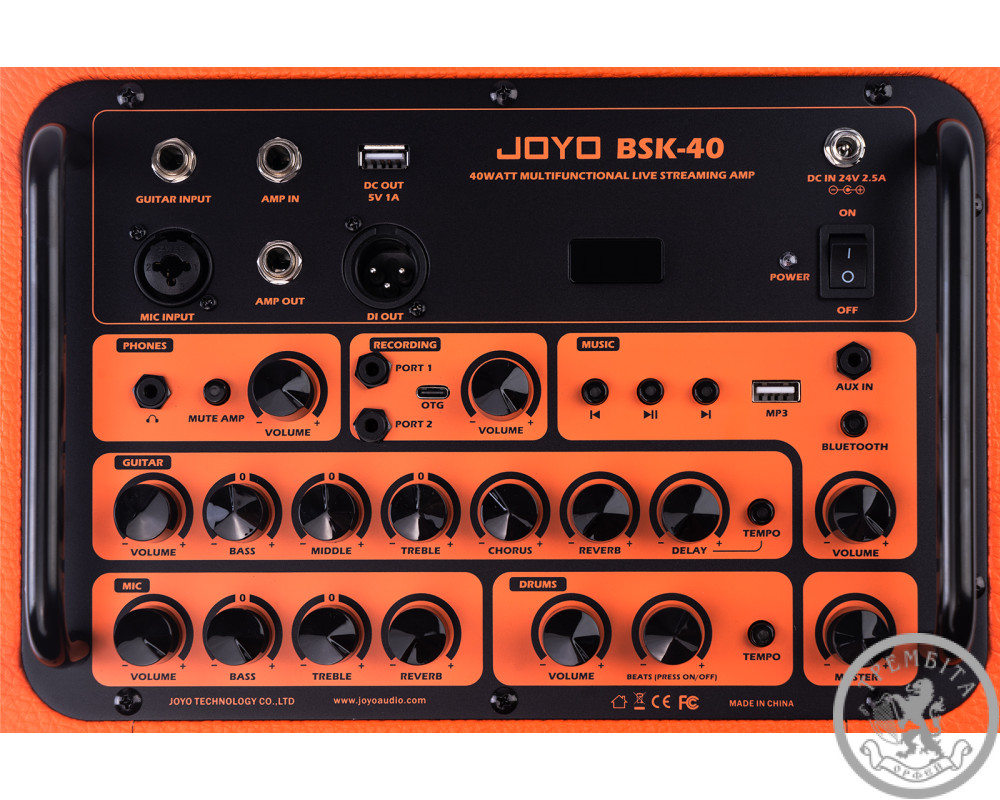 Драм-машина з 20 варіантами ритмічних акомпанементів, роз’єми Amp In і Amp Out, вихід XLR для прямого підключення до мікшерного пульта або аудіоінтерфейсу, jack 3.5 мм вихід для навушників з кнопкою. Комбопідсилювач Joyo BSK-40 має різьбу для кріплення на стійку.