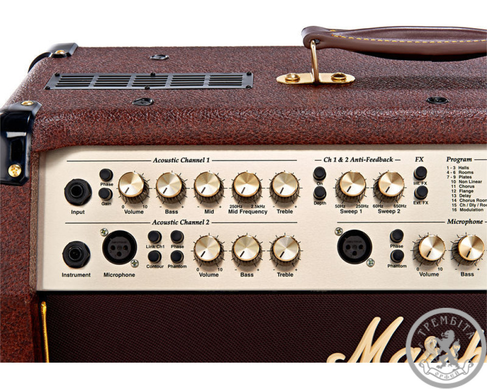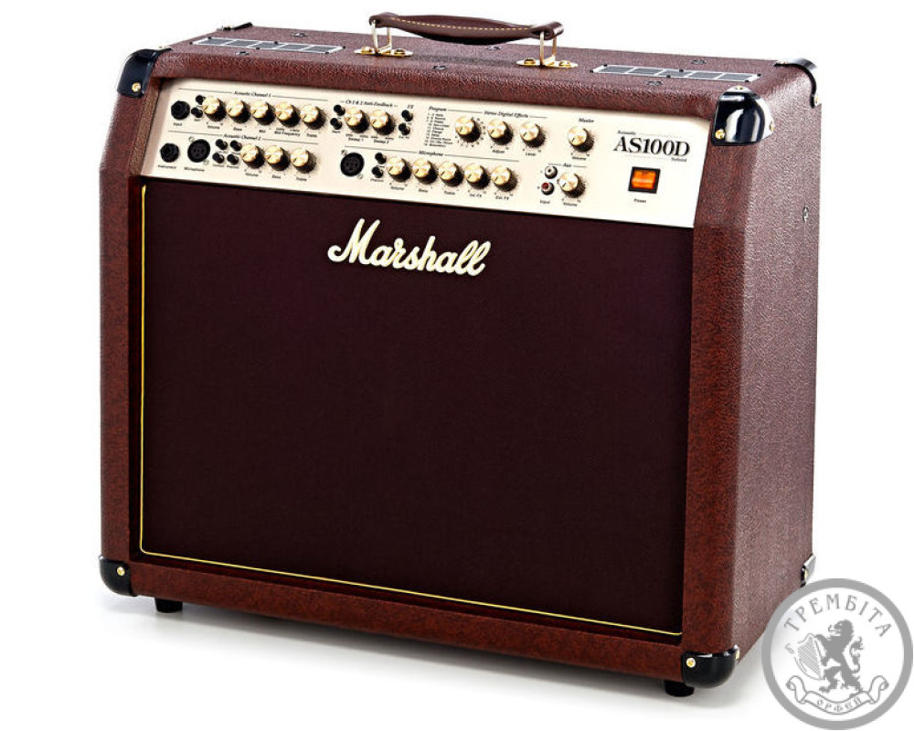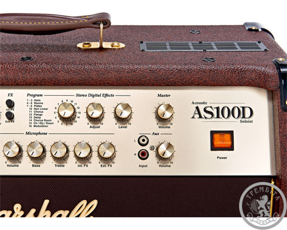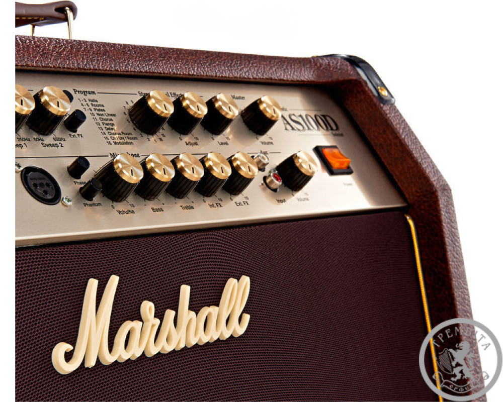 MARSHALL AS100D 100W ACOUSTIC SOLOIST COMBO представляет собой двухканальный комбоусилитель для электроакустической гитары. Комбо является идеальным выбором для практикующих музыкантов и гитаристов. Схема электроники и гитарные динамики с двумя ВЧ-твитерами были специально разработаны для того, чтобы передать качественное звучание электроакустической гитары и вокала. Двухканальный комбоусилитель имеет мощность в 100 Ватт, которых достаточно для озвучивания большого репетиционной комнаты, сцены или рок-клуба. Комбоусилитель оборудован двумя динамиками размеров 8 дюймов каждый и двумя ВЧ-твитерами для более качественного звучания весомых частот. В комбо есть секция эффектов из 16 лучших пресетов, включая различные типы Chorus (а) и Reverb. Секция эффектов в режиме стерео значительно обогащают звучание этого усилителя.