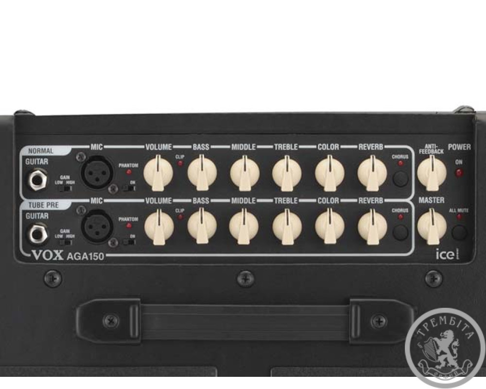 Комбоусилитель для акустичнои гитары, 150 Вт, 2 канала Normal и Tube Pre (на лампе 12AU7), входы 1/4 "джек и симметрично XLR, пер. Чувствительности Lo-Z / Hi-Z, регулирования: Volume, Bass, Middle, Treble , Color, Reverb, Chorus, Anti-