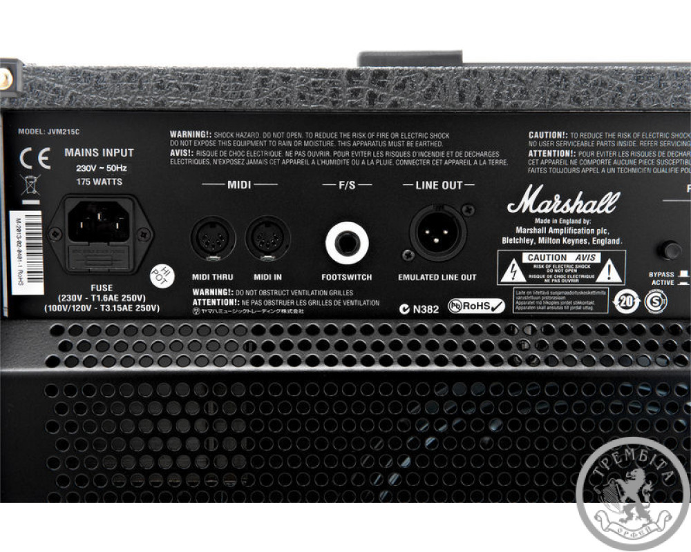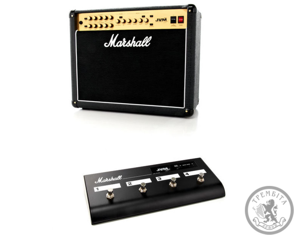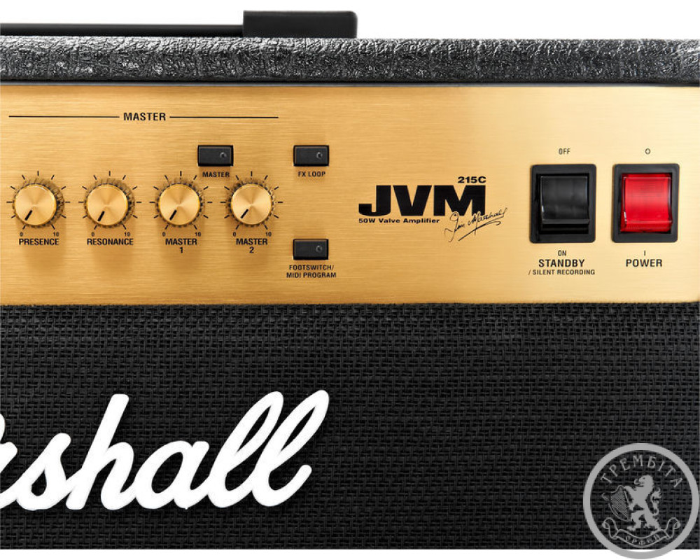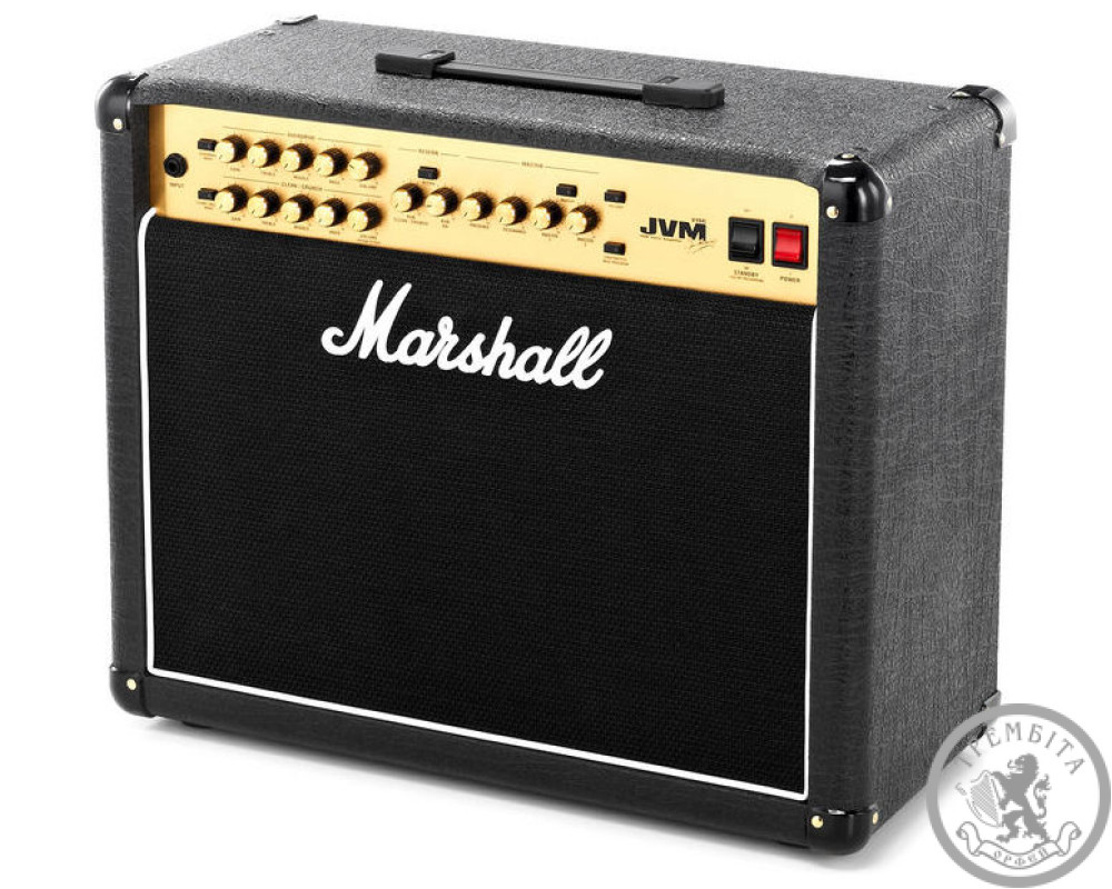 MARSHALL JVM 215C Ламповий комбопідсілювач для електрогітарі, Потужність 50 Вт, 1x12 "Celestion G12B, Опір 8 Ом, 2 канали, 3-смуговій еквалайзер, ревербератор, емульованій лінійний вихід XLR, вхід 1 + МІДІ, петля ефектів, футсвіч, габарити - 605x510x265, вага - 26.5 кг.