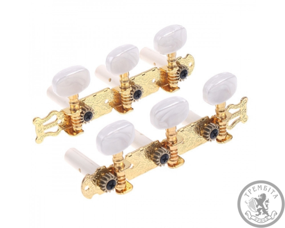 Комплект механики для классической гитары на позолоченной планке с пластиковыми втулками. Ручки кольев изготовлены из белого перламутрового пластика.