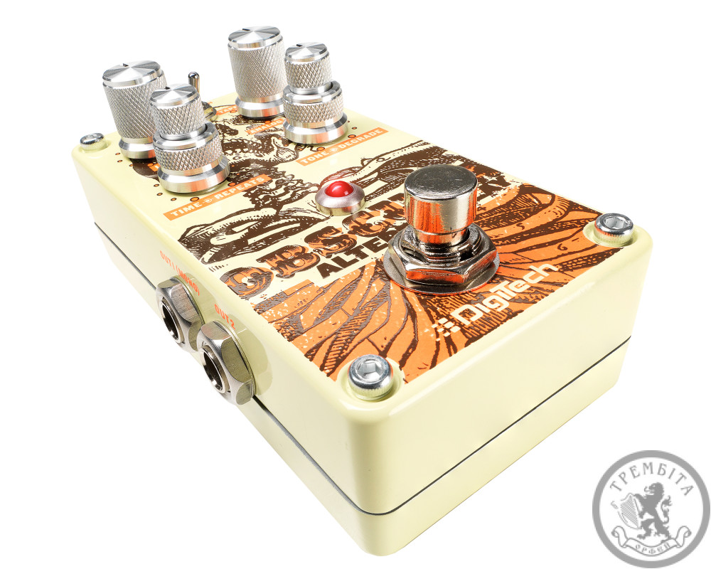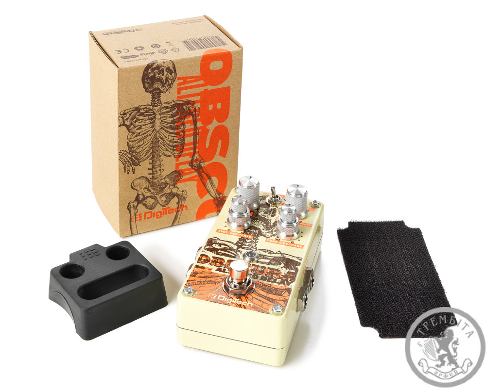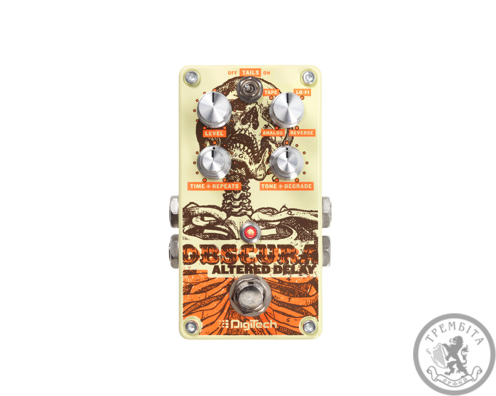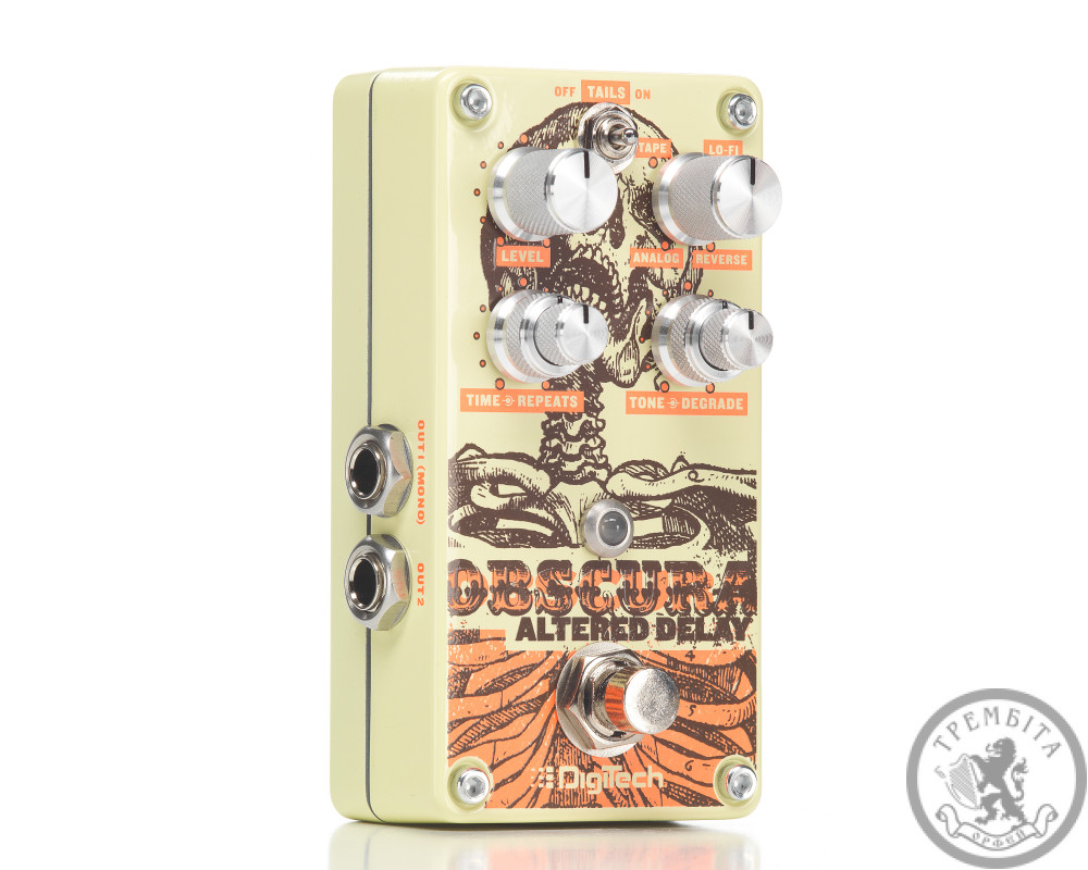DIGITECH OBSCURA - гитарная педаль стерео дилей от известного американского производителя. Предусмотрено четыре типа эффектов: винтажный Analog, классический Tape, Lo-Fi с принудительно уменьшенным диапазоном и глубиной, и Reverse, что воспроизводит повторы в обратном порядке. Все эти эффекты можно дополнительно видоизменять с помощью поворотного регулятора Tone / Degrade, а также настраивать их воспроизведения с помощью Time / Repeats. Переключатель Delay Tails On / Off определяет поведение педали в режиме обхода - при его нажатии повторяющийся сигнал будет продолжать звучать после отключения эффекта. Предусмотрен режим True Bypass, при котором педаль не влияет на выходной звук. Модель заключена в компактный корпус необычного яркого дизайна. Независимые входные и выходные разъемы 1/4 джек размещены по бокам.