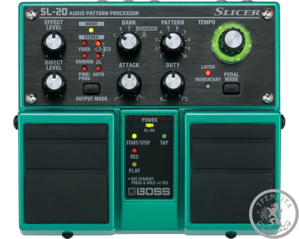 Користувачеві здвоєної педалі ефектів BOSS SL-20 відкривається близько п'ятдесяти (50) вбудованих, ритмічних малюнків. Як справжній віртуоз, Ви можете використовувати будь-який з представлених ефектів обробки, а так же поекспериментувати з «шинкування» всіляких своїх. Пристрій обробки має в своєму арсеналі, спеціально спроектований процесор-«Harmonic Slicer», який якраз і генерує всілякі перкусійні мелодії. Разом з педаллю SL-20 Вам стануть доступні ще більші виконавські можливості, так як педаль обробки оснащена можливістю кільцевого запису музичних фраз. Для того, що б розширити звучання ефектів, програмна частина пристрою оснащена інноваційним ефектом справжнього тривимірного панорамування - «3D Panning». Використовуючи здвоєну педаль обробки звуку BOSS SLICER, Ви привнесете в звучання Вашого інструменту ту саму «родзинку», якою Вам не вистачало раніше і значно розширите можливості звучання Вашого інструменту, будь то електрогітара, клавіші, діджейські «фішки» або вокальна партія!