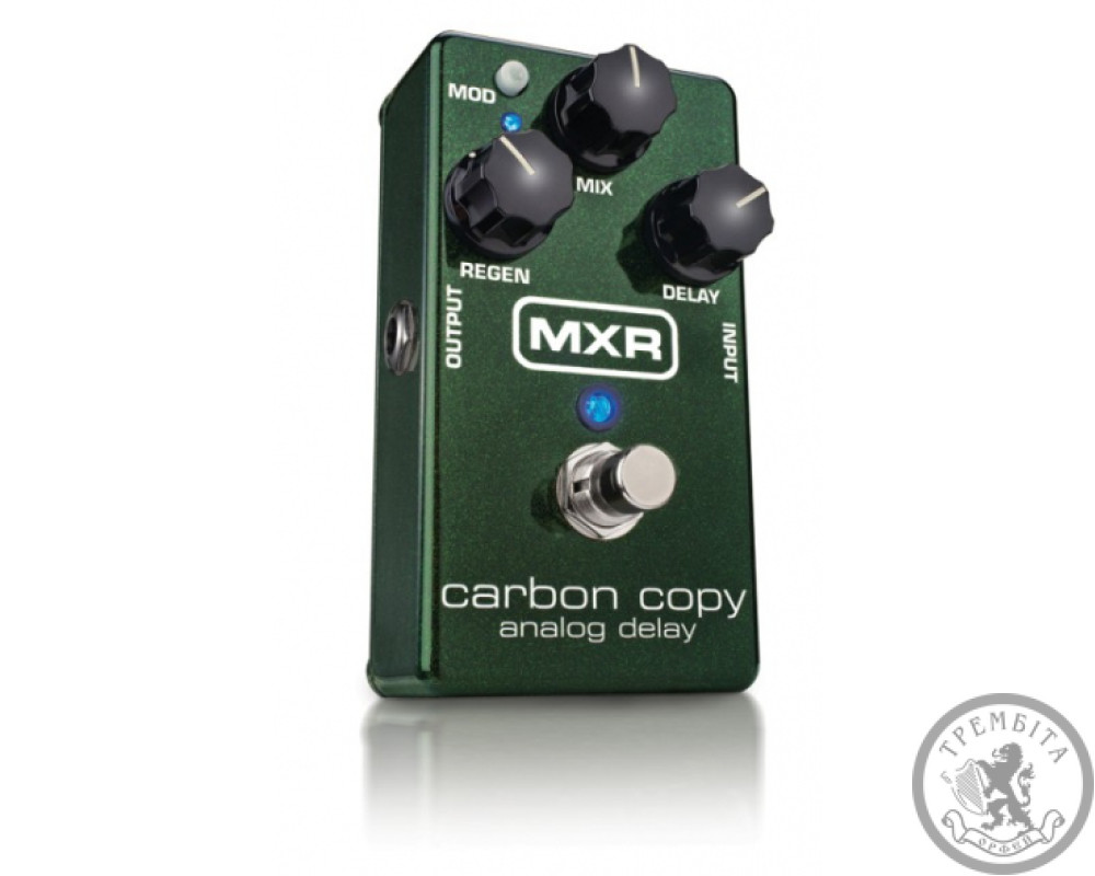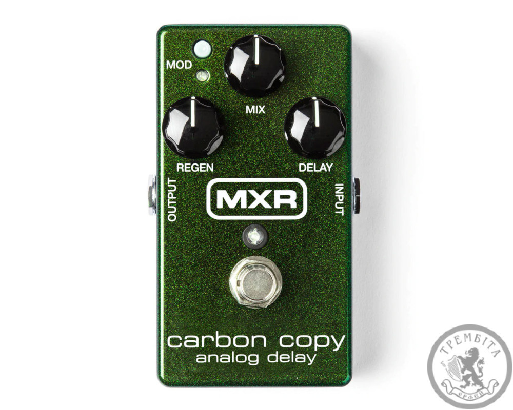 Педаль MXR Carbon Copy Analog Delay є повністю аналогової лінією затримки, з характерною теплотою і багатством звучання - все завдяки "old school" технології конструювання. Педаль має значні 600мсек затримки з можливістю користування ефектом модуляції, кнопка активації якого розташована в лівому верхньому кутку корпусу. Просте управління часом затримки "Delay", міксом чистого і обробленого сигналів "Mix" і кількістю повторень "Regen" - все розташовано в компактній педалі розмірами не більше Phase 90. Крім цього, два додаткових потенціометра розташовані знизу під кришкою всередині корпусу для зміни параметрів ширини і ступеня модуляції.