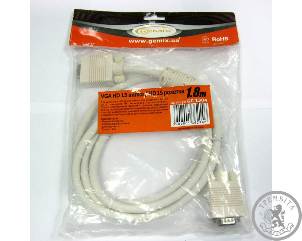 Кабель Gemix VGA HD15. GC 1304 (Штекер - Гнездо) (длина 1.8м)