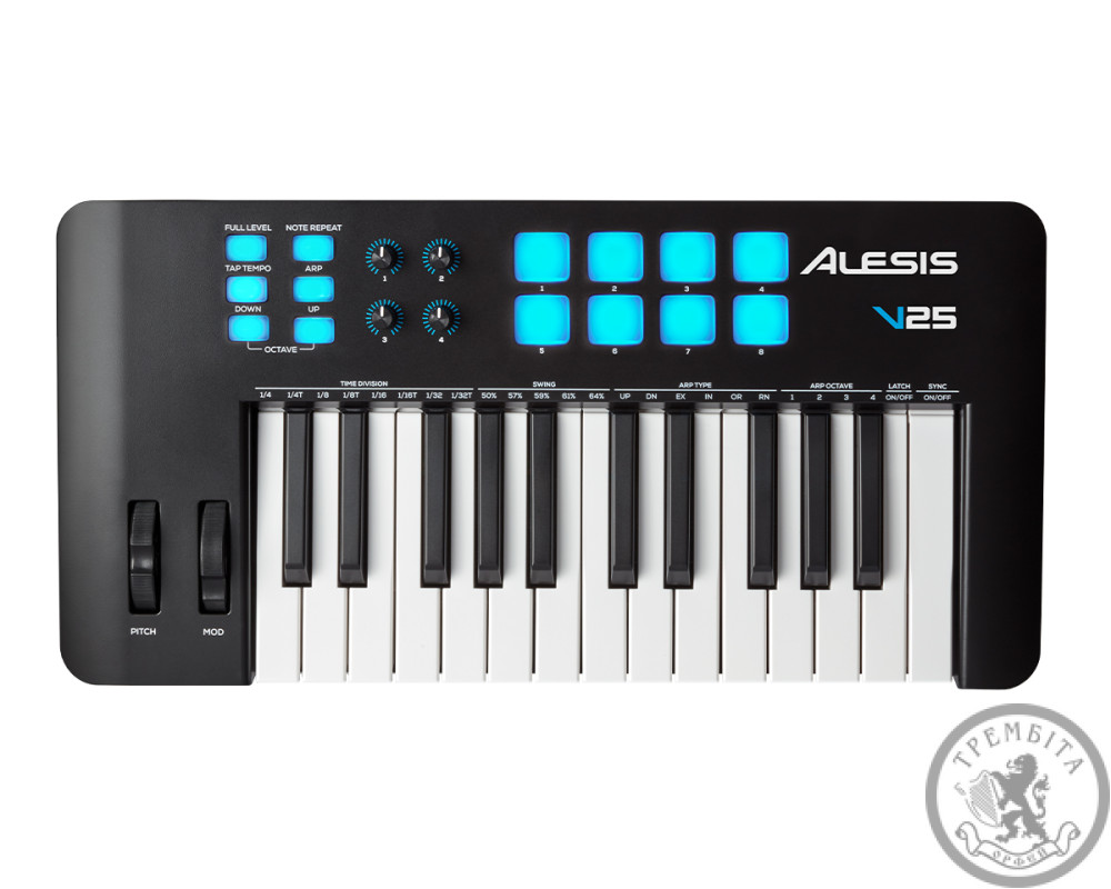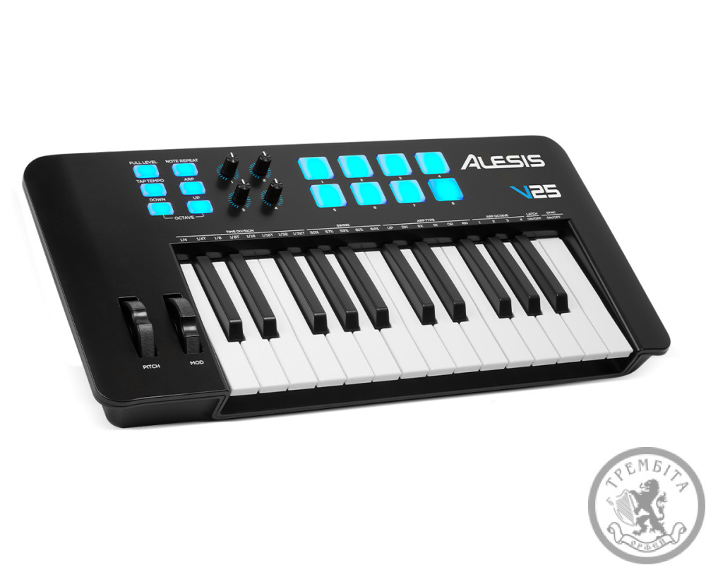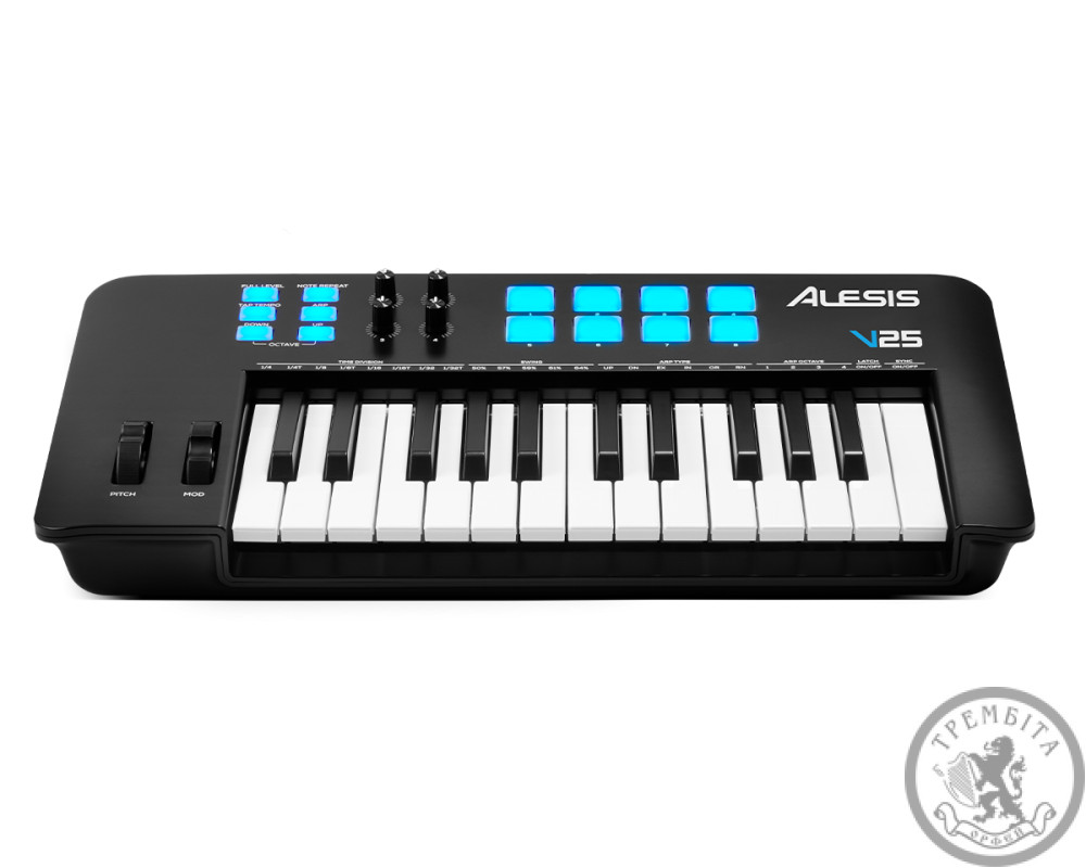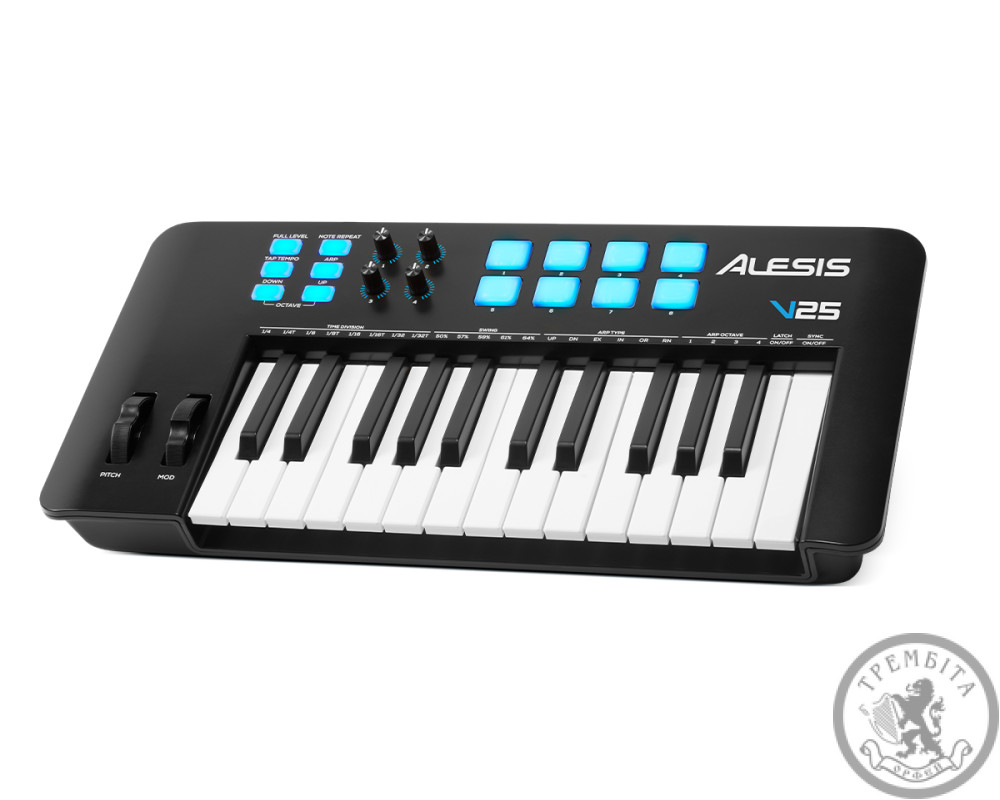 Портативний V25 - 25-клавішний контроллер, який можна брати з собою куди завгодно і який ідеально підходить для створення музики на ходу. Контролер оснащений багатим функціоналом: