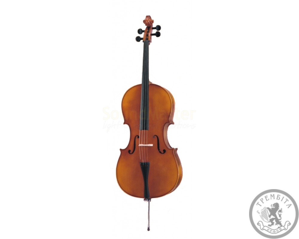 Віолончель учнівська розміром 4/4 з ялиновою верхньою декою, кленовою нижньою декою і обичайкою, накладкою грифа, кілками, струнотримачем з матеріалу, обробленого під чорне дерево і полірованим лаковим покриттям корпусу.
