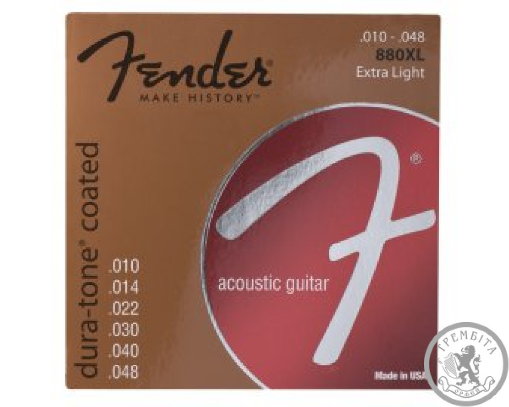 FENDER 880XL струни від легендарної компанії FENDER мають калібрування .010, .014, .022, .030, .040, та .048. Вони виготовлені з бронзи, що забезпечує високу якість звучання. Завдяки матеріалу з якого зроблені ці струни вони прослужать музикантові тривалий час і не підведуть у відповідальний момент. Ваша акустична гітара буде мати дуже дзвінкий та яскравий тембр звучання. У комплекті йде 6 струн з натягом Extra Light.