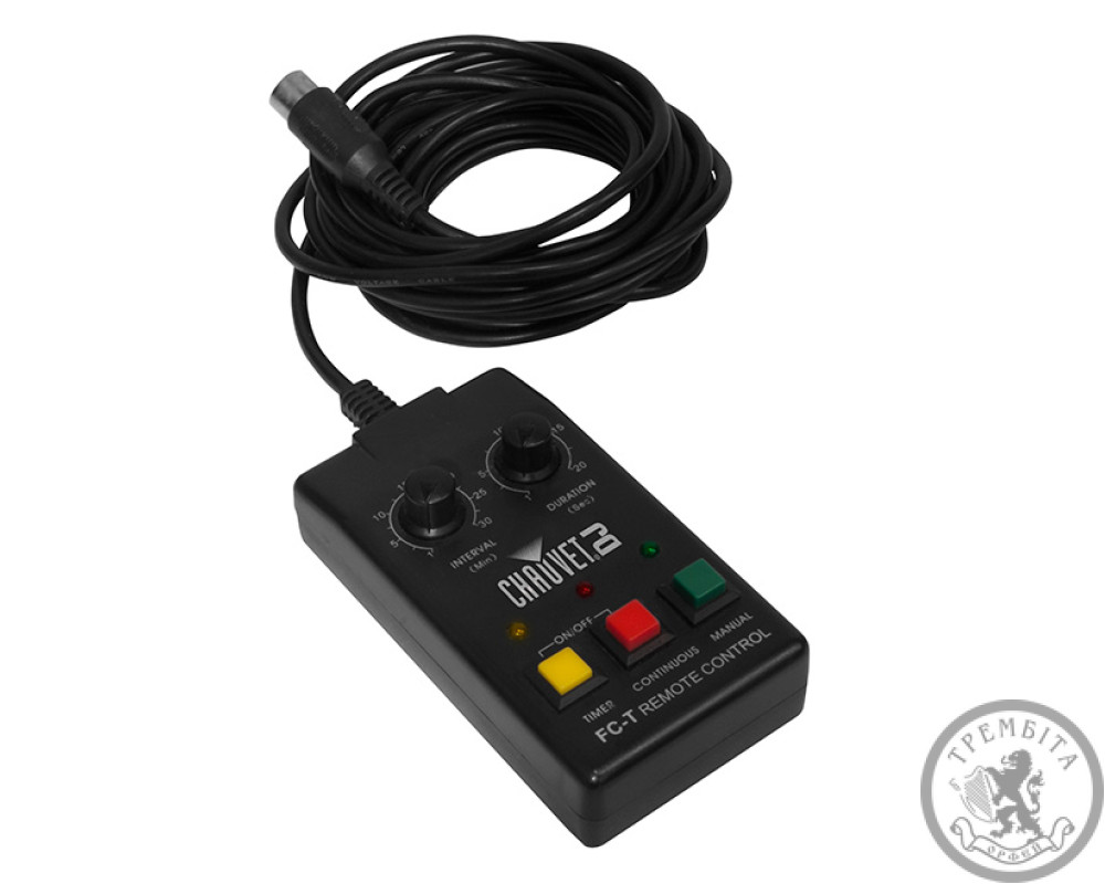 Chauvet FC-T являє собою пульт дистанційного керування, сумісний з більшістю дим машин CHAUVET®. Три світлодіодні індикатори відображають активність таймера, режим постійного диму і готовність дим машини. Два поворотних регулятора дозволяють встановити інтервал і тривалість роботи дим машини.