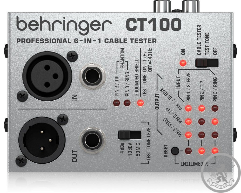 Behringer CT100 — це компактний 6-в-1 кабельний тестер, що дозволяє перевіряти кабелі з роз'ємами XLR, TRS, RCA та MIDI. Він має режими тестування цілісності кабелів, коротких замикань, фантомного живлення та заземлення, а також генерує тестові тони (1 кГц або 440 Гц). Живиться від двох батарей AA, що робить його зручним для використання на виїздах або під час виступів.