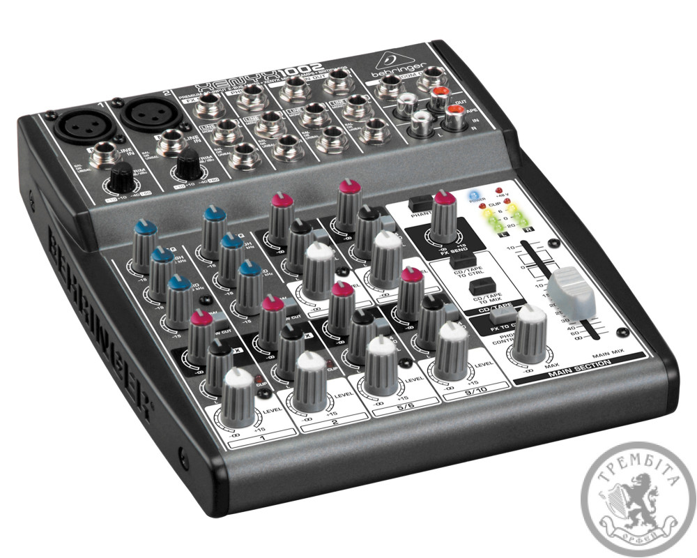 XENYX 1002 має 10 входів і регулятор посилу FX Send в кожному каналі. Також передбачені призначувані входи CD / tape для гнучкої маршрутизації. Behringer XENYX 1002 - дуже компактний малошумний мікшерний пульт преміум-класу, має 2 моновхода, 4 стереовхода, 1 шину Aux.