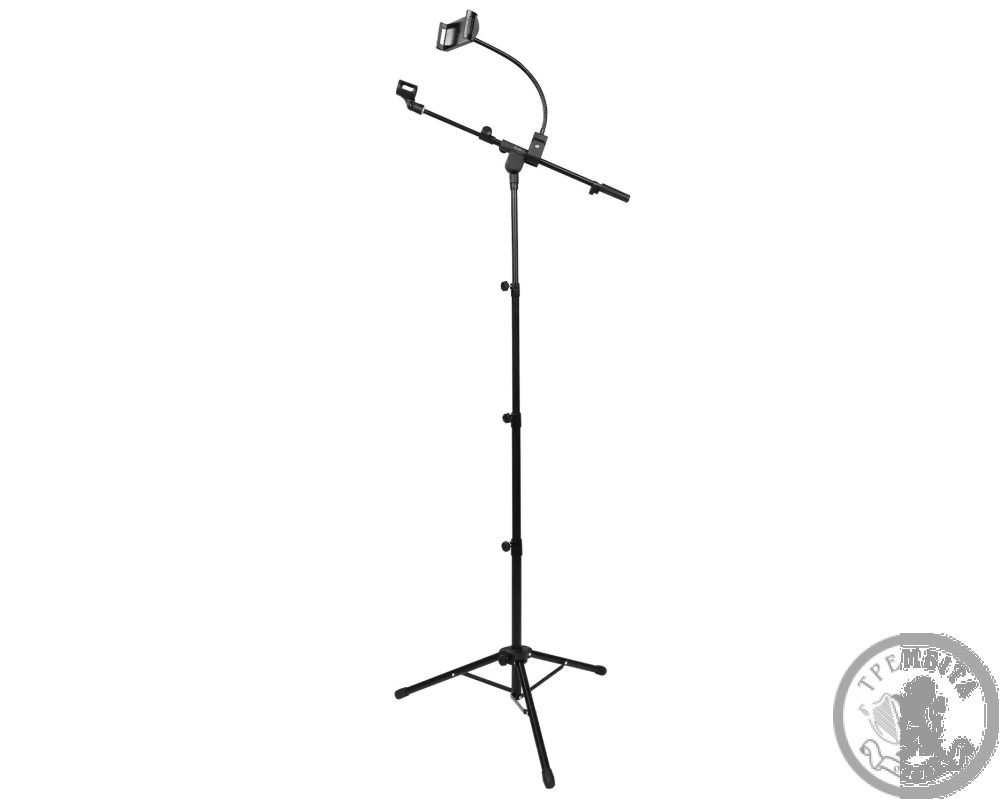 Мультифункціональна мікрофонна стійка в комплекті з тримачем для смартфона/планшета та чохлом. Чудовий вибір для проведення прямих трансляцій, практики, виступів на сцені чи на вулиці.