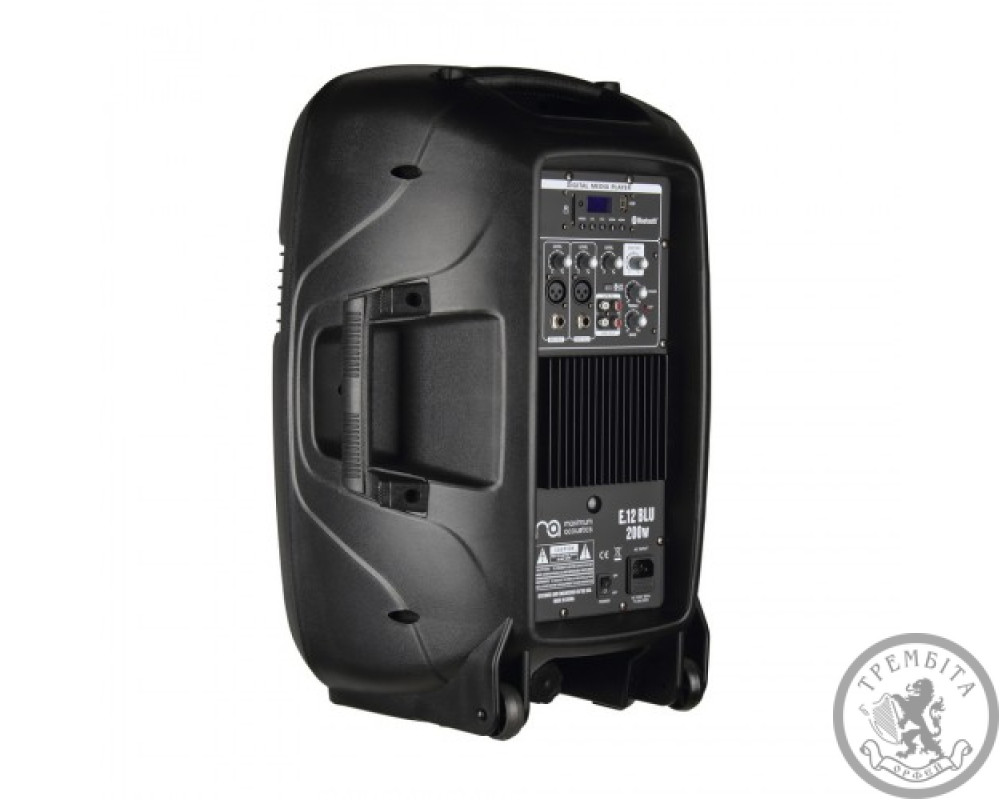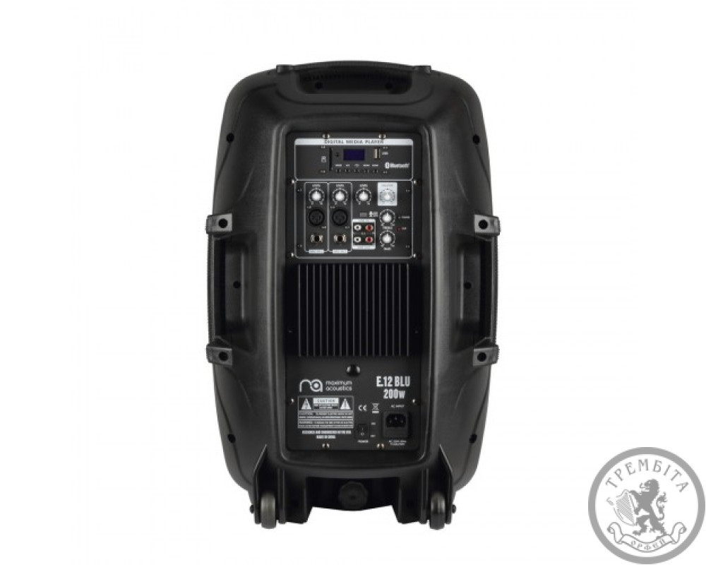 Maximum Acoustics E.12 BLU - это 2-полосная активная акустическая система, которая имеет на борту интегрированный MP3 плеер, воспроизводящий музыку с карт памяти SD/MMC и USB устройств и FM радиоприемник. Плеер имеет интуитивно понятное кнопочное управление на задней панели и дисплей, отображающий основную информацию, а также средства управления (MODE, PLAY, SELECT, REPT, PREV, NEXT). На задней панели расположены слот для карты памяти SD/MMC, USB порт, Bluetooth и инфракрасный порт (IR).