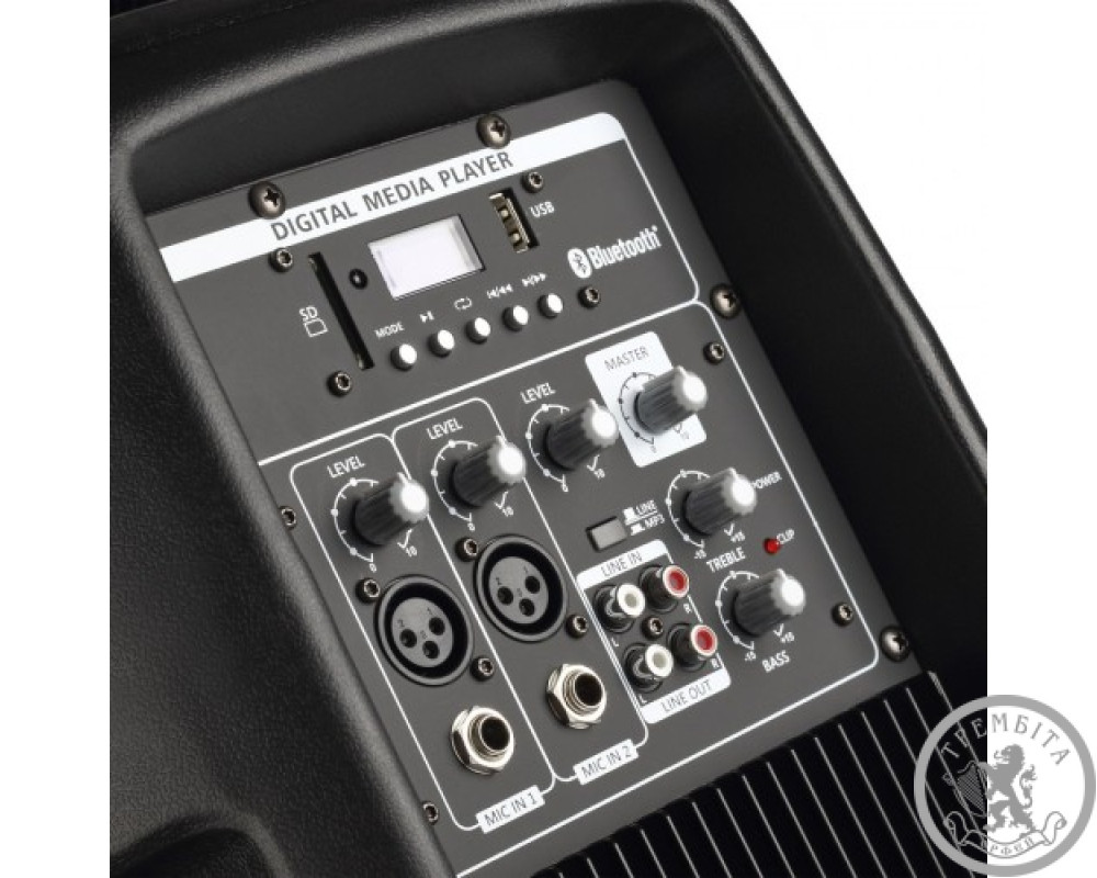 Акустическая система оборудована двухполосным эквалайзером и общим регулятором громкости (MASTER), около которого расположены также светодиодные индикаторы CLIP и POWER.