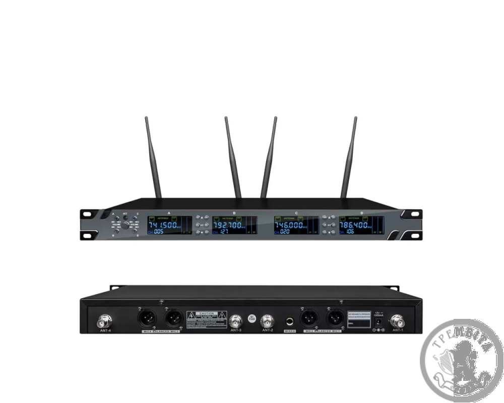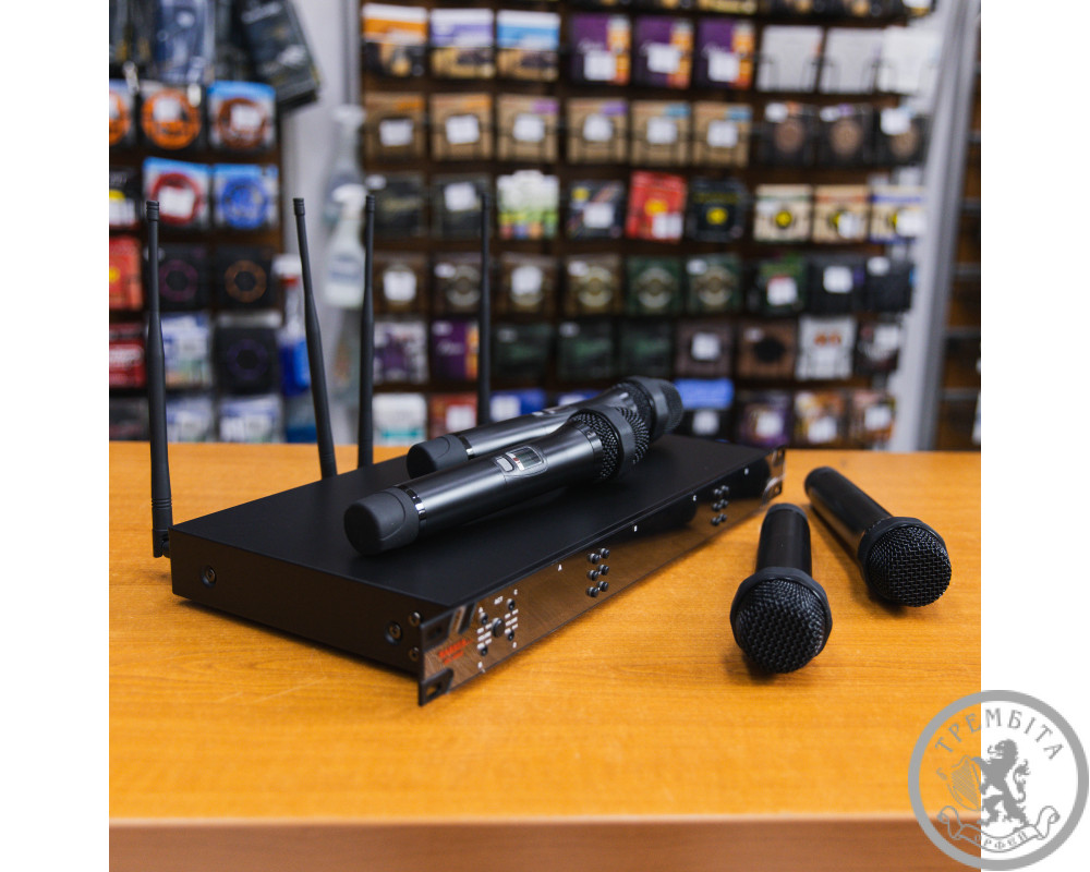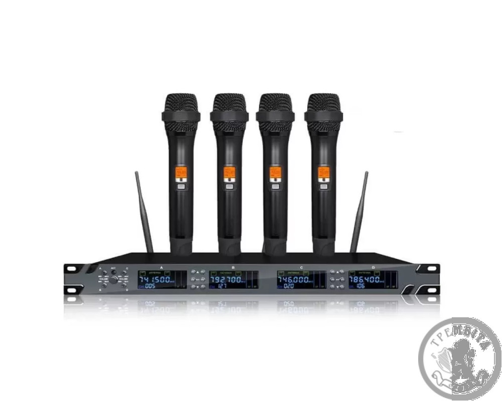 Радіосистема 4-канальна з 4 ручними вокальними мікрофонами Перевагою цієї радіосистеми є 200 переналаштовуваних каналів. Можливість використовувати 4 комплекти одночасно (16-мікрофонів).