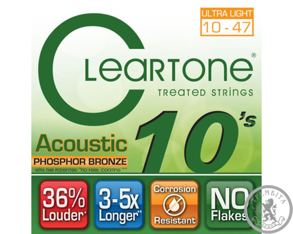 Cleartone - нове покоління струн преміум класу з унікальним покриттям, що запобігає окисленню і продовжує термін служби в 3-5 разів. Ультратонкі (менше одного мікрона!) Покриття зберігає природні відчуття від дотику, воно не слизьке, з часом не облазить, не лущиться і, найголовніше, інструмент з цими струнами буде грати дзвінкіше і потужніше.