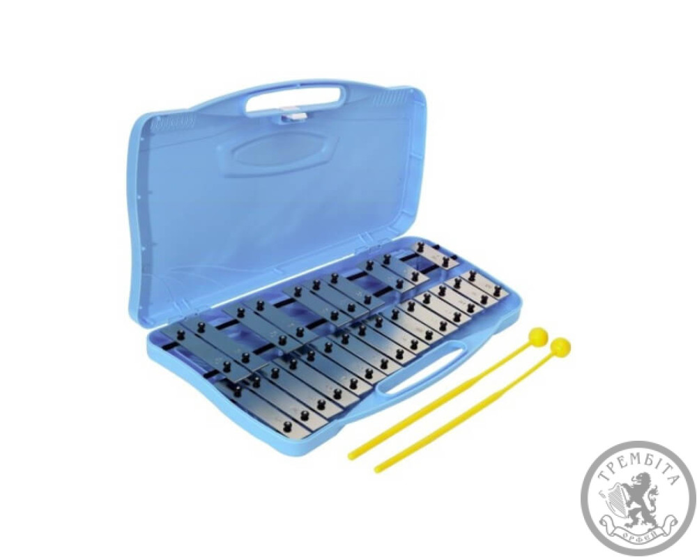 GEWA Bells 847000 - хроматичний металофон з 25-ма металевими пластинами, які розміщені в пластиковому кейсі. Тональний діапазон складає G2-G4. В набір входять два ударні молоточки для гри.