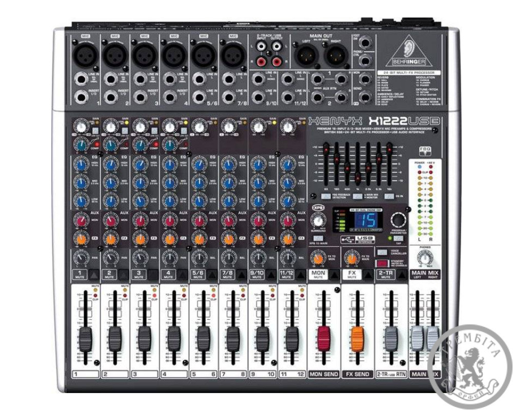 Behringer XENYX X1222USB це надкомпактний, малошумний мікшер, випущений в лінійці аналогових пристроїв преміум-класу. Мікшер обладнаний чотирма моновходами з незалежними компресорами, кожен з яких має незалежні ручки управління ефектом. Чотири стереофоничні входи дають можливість підключити найрізноманітніші стерео пристрої (цифрові роялі чи фортепіано).