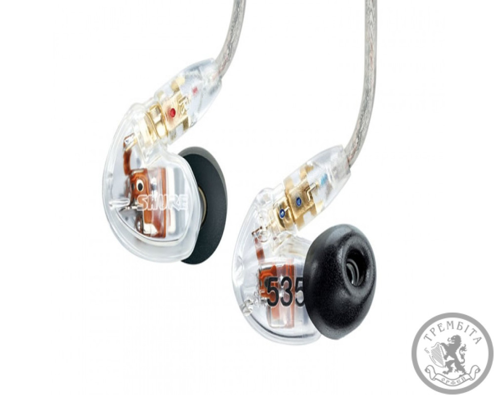 SHURE SE535-CL - внутрішньоканальні моніторні навушники професійного рівня з лінійки Sound Isolating ™. Ця модель оснащена трьома високоякісними мікродрайверами: одним високочастотним і двома низькочастотними, що дозволяє отримати багате звучання з глибокими, насиченими басами. Звук навушників відрізняється чудовими деталями завдяки сучасній технології, багаторазово протестованої професійними музикантами і доведеної до досконалості інженерами Shure. Конструкція навушників забезпечує ідеальну звукоізоляцію, до 37 дБ, що відображено в назві моделі. Ергономічна форма корпусу і м'які амбушюри декількох розмірів дозволяють комфортно розмістити навушники, завдяки чому їх можна використовувати тривалий час без будь-якого дискомфорту. Гнучкий знімний кевларовий кабель навушників з позолоченим коннектором, який можна повертати на 360 градусів, також забезпечує зручність носіння. Кабель можна легко замінити самостійно при його зносі. Навушники SE535 випускаються в двох варіантах колірного виконання. Представлена модель має ефектний незвичайний зовнішній вигляд завдяки прозорому корпусу.
