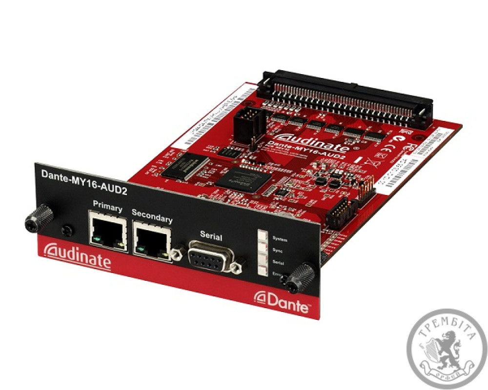 Карта Audinate Dante-MY16-AUD2 повністю сумісна Yamaha Mini-YGDAI стандартом карт розширення і дозволяє Вашому мікшерy, процесору або підсилювачy потужності працювати з аудіопотоком Dante. Dante-MY16-AUD2 забезпечує 16 двонапрямлених каналів (8 каналів при частоті 96 кГц) і повноцінну мережу Dante з можливістю резервування потоків по Gigabit Ethernet каналах. Можливе використання декількох карт одночасно для збільшення кількості каналів, підключення до Dante-сумісного обладнання а так само до PC / Mac з використанням ПЗ Dante Virtual Soundcard для багатоканального запису / відтворення з ПК.