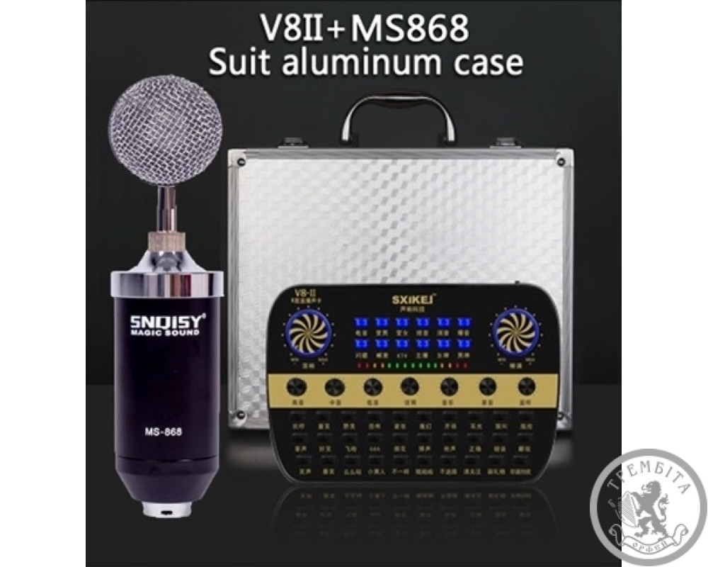 Комплект складається з процесора V8II, дротового мікрофона, алюмінієвого кейсу та металевої стійки, тримач типу "павук"